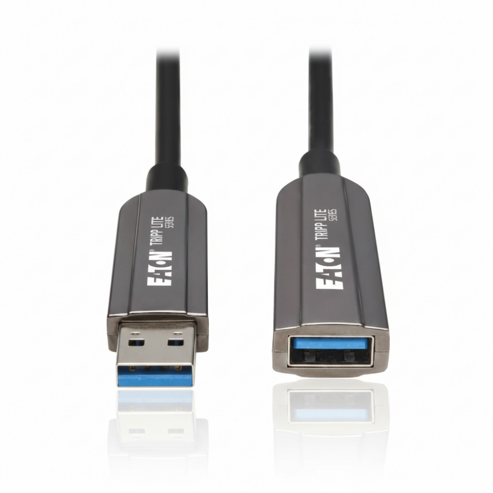 The Eaton Tripp Lite Series U330F-30M-G1 is an active optical USB 3.2 Gen 1 extension cable designed to overcome the distance limitations of traditional copper cabling. This 30-meter (98-foot) fiber optic cable provides a robust solution for extending USB-A connections, enabling the placement of devices like servers, external hard drives, or surveillance cameras in locations previously inaccessible due to cable length restrictions. Engineered for high-speed data transmission, it maintains signal integrity over long distances, ensuring reliable performance in demanding IT environments. Leveraging fiber optic technology, this active extension cable supports USB 3.2 Gen 1 data transfer rates of up to 5 Gbps, which is significantly faster than older USB 2.0 standards. Unlike passive copper cables, its active design allows for sustained high performance without signal degradation over its extended length. The cable's slim and flexible construction facilitates easier routing through conduits and around obstacles, simplifying installation in complex infrastructure setups. The U330F-30M-G1 is equipped with a CL3-rated PVC jacket, making it suitable for in-wall installation in both commercial and residential settings, adhering to fire safety standards. Its plug-and-play design ensures straightforward deployment, requiring no special software or drivers across Windows, macOS, and Linux operating systems. An included USB Micro-B booster cable provides optional auxiliary power for devices that may require it, ensuring stable operation for various USB peripherals.