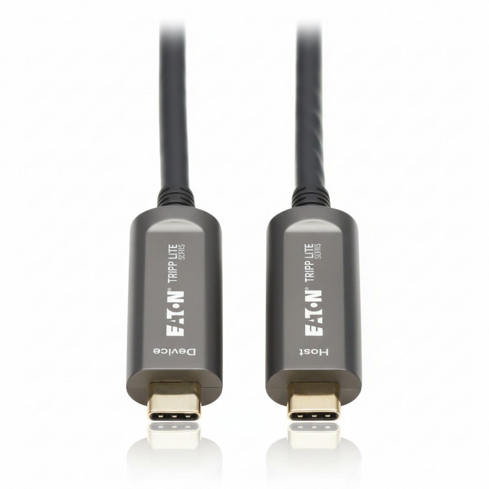 The Eaton U420F-10M-D321 is a high-performance USB-C Active Optical Cable (AOC) designed to extend USB 3.2 Gen 2 connectivity over longer distances than traditional copper solutions. This data-only cable facilitates robust, high-speed data transfer between a computer's USB-C port and a compatible USB-C device, such as a server, external hard drive, or surveillance camera, located up to 10 meters (33 feet) away. It addresses the challenge of maintaining signal integrity and speed over extended runs, which is crucial for flexible infrastructure deployments in data centers, offices, or integrated AV systems. Utilizing advanced fiber optic technology, the U420F-10M-D321 offers a slim and flexible design that significantly simplifies installation. Unlike bulky copper cables, its reduced diameter allows for easier routing around corners and through confined spaces behind equipment racks. The cable supports USB 3.2 Gen 2 data transfer rates up to 10 Gbps, ensuring rapid and efficient communication for high-bandwidth applications, while also maintaining backward compatibility with older USB generations including USB 3.2 Gen 1, 2.0, and 1.1. Equipped with a plenum-rated (CMP) jacket, this cable is suitable for in-wall installations, adhering to strict fire safety codes for horizontal premise applications in air ducts and drop ceilings. It draws power directly from the connected device, eliminating the need for an external power supply for devices requiring up to 1A. For devices demanding more than 1A, an external power source for the connected device will be necessary. This plug-and-play solution supports major operating systems including Windows, macOS, and Linux, ensuring broad compatibility across diverse IT environments.