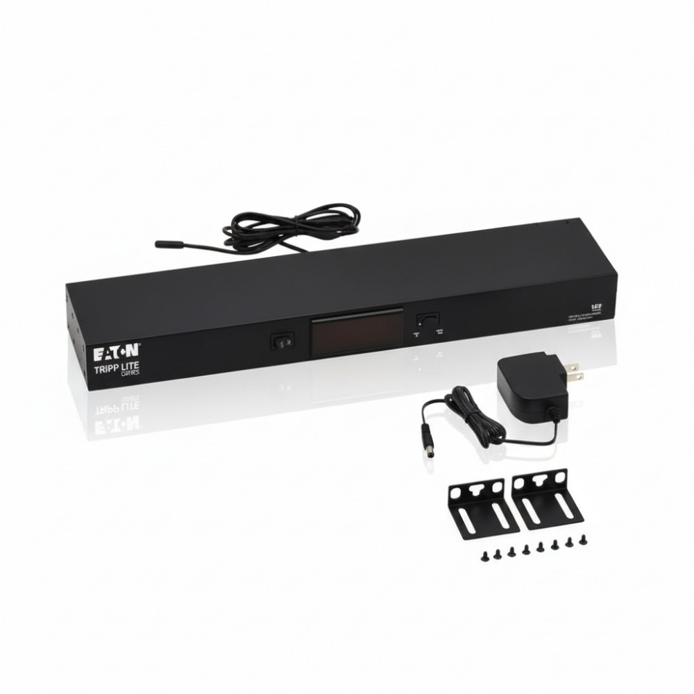 The Eaton SR1UPNLTEMP is a crucial environmental monitoring device designed to optimize thermal performance and protect critical IT assets within standard EIA 19-inch server racks. This innovative solution combines the functionality of a 1U blanking panel with an integrated digital temperature sensor and LCD display, addressing the common challenge of hot spots and inefficient cooling in data center and server room environments. By sealing off unused rack unit spaces, the blanking panel prevents hot air recirculation, ensuring that cooling airflow is directed efficiently across active equipment. At its core, the SR1UPNLTEMP features a highly accurate temperature sensor that can precisely measure conditions within a rack, with a wide range from -58°F to 302°F. The accompanying 6-foot sensor cable allows for flexible placement, enabling administrators to identify and monitor thermal anomalies or hot spots at various locations, including the top or rear of the rack where heat often accumulates. Real-time temperature readings are conveniently displayed on a front-panel LCD, which can be toggled between Fahrenheit and Celsius for immediate, actionable insights into rack health. This robust blanking panel is constructed from cold-rolled steel with a black powder-coated finish, ensuring durability and a professional aesthetic within any rack enclosure. Designed for straightforward integration, it mounts effortlessly into just 1U of available rack space, providing both aesthetic appeal and critical thermal management without requiring complex configurations. The standalone operation, powered by an included 12V DC supply with a NEMA 1-15P plug, allows for flexible deployment in conjunction with existing PDUs or UPS systems, making it an invaluable tool for maintaining optimal operating temperatures and extending the lifespan of valuable IT equipment.