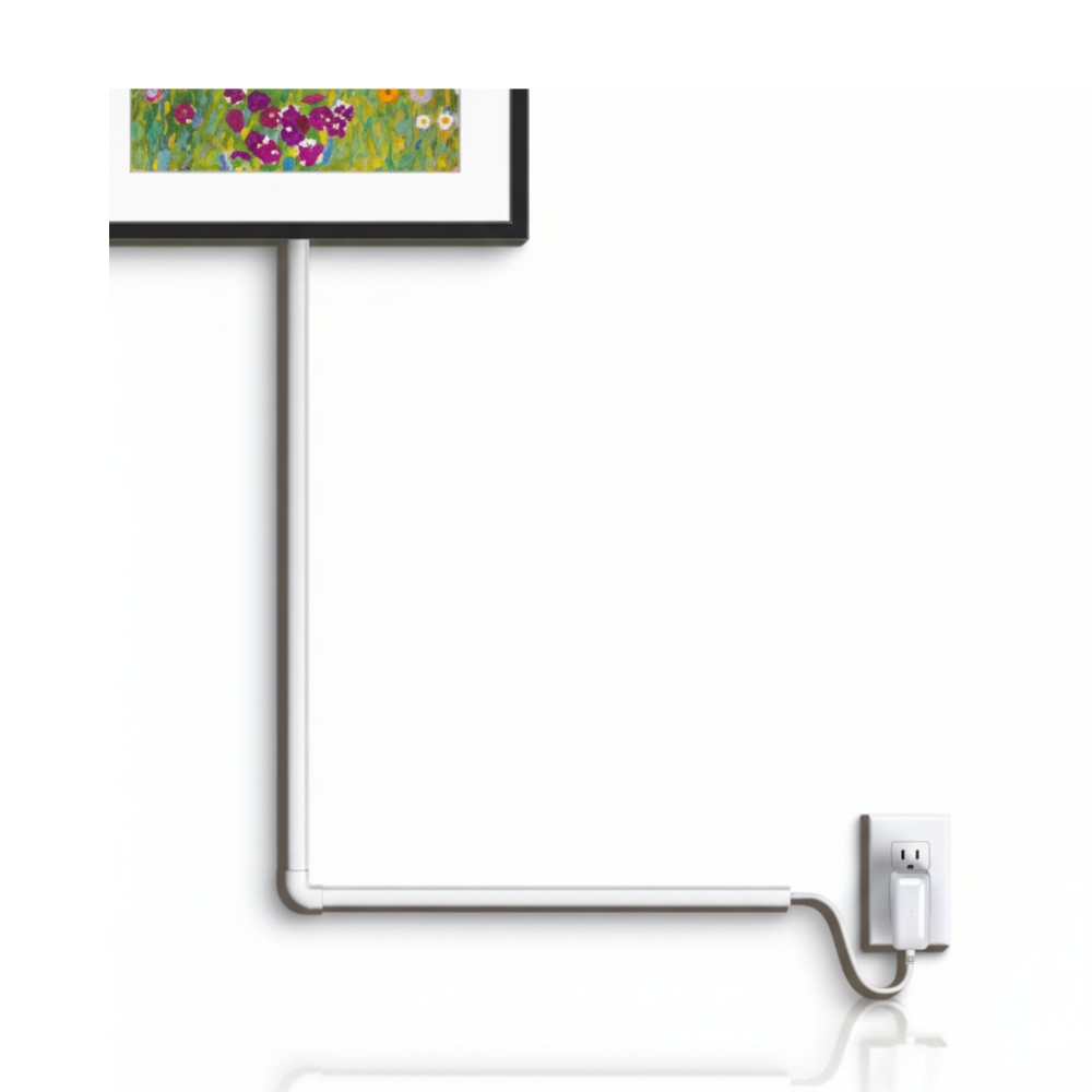 The MCAR1-10000S is a cable cover (raceway) accessory for the Meural Canvas digital art frames, used to conceal the power cord and maintain a clean installation. It supports both portrait and landscape orientations and attaches via self-adhesive backing. The kit includes multiple plastic raceway segments and corner connectors to route the cord along walls. It is used in residential, gallery, or office mounting environments for aesthetic cable management.