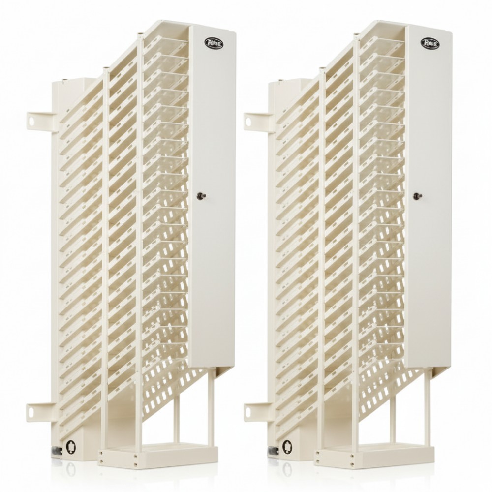 The Eaton CST40AC is a robust, floor-standing AC charging station designed to securely store and rapidly charge up to 40 Chromebooks, tablets, or other mobile devices with screens up to 16 inches. Comprising two individual 20-device towers, this system addresses the critical need for efficient device management in high-density environments such as educational institutions, small to medium-sized businesses, healthcare facilities, and government agencies. It provides a centralized, secure location for devices, eliminating clutter and ensuring they are fully powered and ready for use when needed. Each tower within the CST40AC system is equipped with 20 internal NEMA 5-15R outlets, delivering dedicated high-speed AC charging for each device's power adapter. This configuration prevents charging delays and ensures quick turnaround times for all connected devices. A 15-amp circuit breaker is integrated into each tower to protect against overloads, safeguarding valuable electronics. The open frame design facilitates visual inventory checks without compromising security. Designed for practical deployment, the CST40AC towers feature a space-saving footprint of less than two square feet each and are intended to be wall-anchored for enhanced stability and theft deterrence. Constructed from heavy-duty steel with a durable white powder-coated finish, the unit offers secure storage with key-locking front doors and top access panels, alongside strategically placed security bars. Integrated cable management slots keep power cords organized and prevent tangles, contributing to a tidy and efficient charging environment.