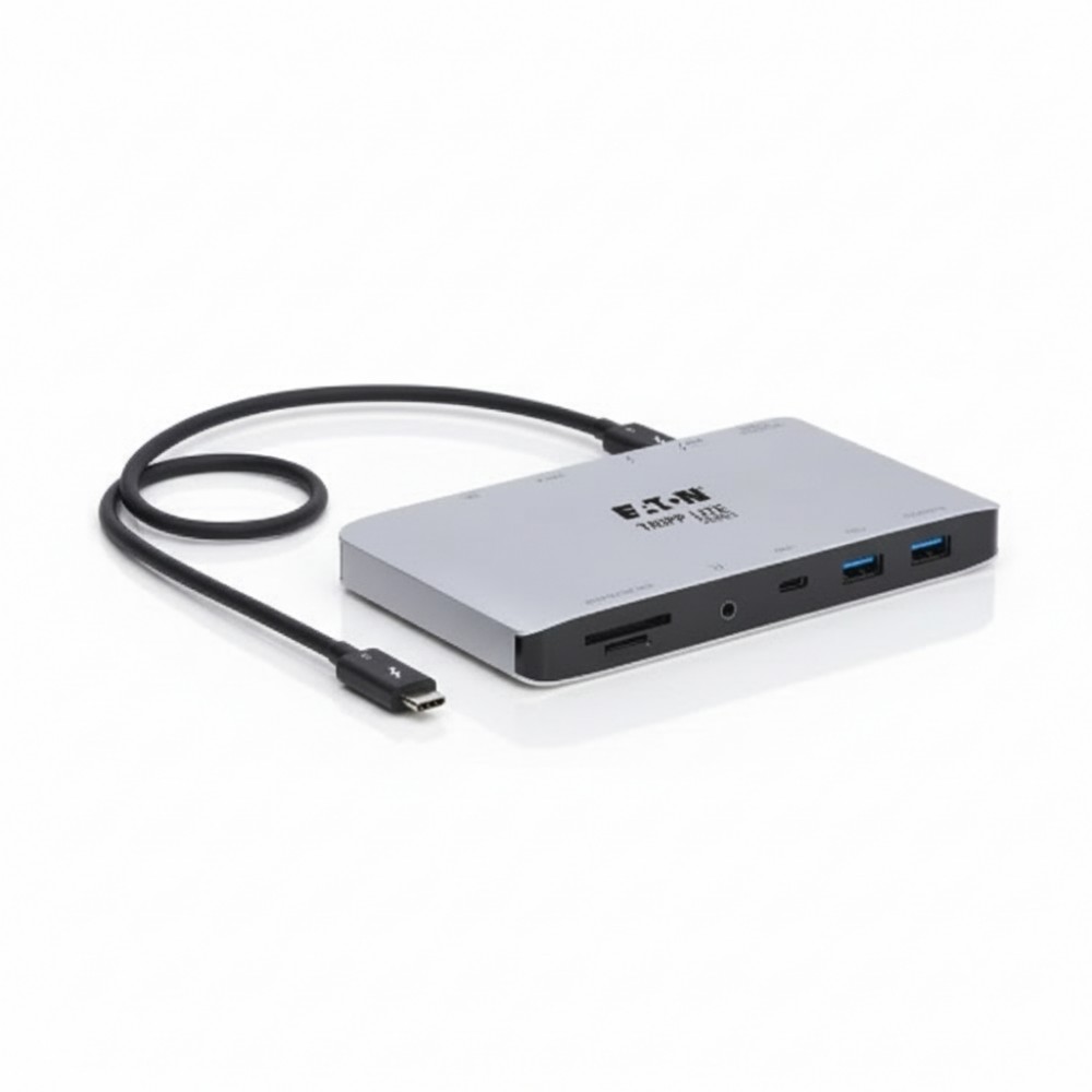 The Eaton MTB3-DOCK-03 is a versatile Thunderbolt 3 docking station designed to dramatically expand the connectivity and capabilities of modern MacBook Pro and Windows laptops through a single high-speed connection. Engineered to address the demands of professional workstations, it transforms a portable device into a powerful desktop environment by adding 10 essential ports. This solution is ideal for users requiring robust multi-display support, rapid data transfer, and comprehensive peripheral connectivity without the clutter of multiple adapters. Leveraging Thunderbolt 3 technology, the dock facilitates bidirectional data transfer speeds of up to 40 Gbps, ensuring seamless handling of bandwidth-intensive tasks such as 8K video streaming, large file transfers, and real-time editing. It supports crystal-clear 8K video to a single display or dual 4K displays simultaneously, catering to professional editors, graphic designers, and users with complex visual workflows. Integrated USB 3.2 Gen 2 ports deliver lightning-fast 10 Gbps data rates for connected peripherals like external drives and flash media, while dedicated charging ports keep devices powered. Housed in a compact form factor, the MTB3-DOCK-03 integrates effortlessly into any workspace. Its comprehensive port selection includes Gigabit Ethernet for reliable wired network access, a 3.5 mm stereo audio jack for headsets or speakers, and dedicated SD/Micro SD card slots for convenient media access. The included Thunderbolt 3 cable ensures immediate plug-and-play functionality, providing up to 60W of power delivery to charge the connected laptop, simplifying cable management and optimizing productivity.