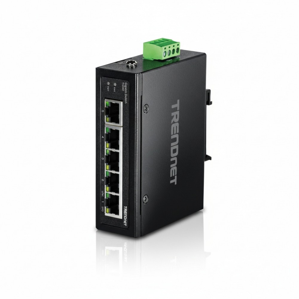 The TRENDnet TI-G50 is a hardened, unmanaged industrial Ethernet switch designed for reliable network connectivity in extreme environments. This Layer 2 switch provides a straightforward solution for expanding network access in locations such as manufacturing floors, warehouses, and outdoor enclosures where temperature fluctuations, vibration, and shock are common concerns. Its primary function is to deliver stable Gigabit speed connectivity to devices like IP cameras, access points, and industrial controllers, ensuring consistent data flow for critical operations. Engineered with a rugged IP30-rated metal housing, the TI-G50 is built to withstand harsh conditions. Its fanless design ensures silent operation and reduces the risk of mechanical failure from dust and debris. A key feature is its wide operating temperature range of -40° to 75° C (-40° to 167° F), which guarantees performance in both freezing and high-heat settings. This resilience makes it a dependable component for mission-critical industrial applications where network uptime is paramount. Deployment is simplified with included DIN-rail and wall mounting hardware, allowing for flexible installation in various industrial control panels and cabinets. The switch features dual redundant power inputs with overload current protection, a critical feature for maintaining network availability. By connecting to two independent power sources, the TI-G50 can continue operating even if one power source fails, supporting zero downtime applications and minimizing operational disruptions.