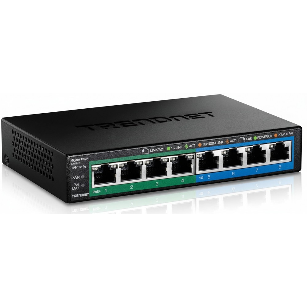 The TRENDnet TPE-TG44G is an unmanaged 8-port Gigabit PoE+ switch designed to reduce equipment and installation costs by delivering both data and power over existing Ethernet cables. This device is ideal for small to medium-sized business environments that need to power devices such as IP cameras, VoIP phones, and wireless access points without installing separate power outlets for each device. It offers a straightforward, plug-and-play solution for expanding network connectivity efficiently. This switch features four Gigabit PoE+ ports and four standard Gigabit non-PoE ports, providing flexibility for connecting a mix of powered and non-powered devices. A key technical advantage is its 60W total PoE power budget, with the ability to supply up to 30 watts per port. This capability ensures sufficient power for high-demand 802.3at devices. With a total switching capacity of 16 Gbps, the TPE-TG44G effectively prevents network congestion and maintains smooth data flow. Designed for desktop installation, the switch features a compact, fanless metal housing, making it a durable and quiet addition to any workspace. As an unmanaged switch, it requires no configuration, simplifying deployment. Its auto-sensing technology automatically detects and delivers the required power to PoE (802.3af) and PoE+ (802.3at) devices while safely providing only data to non-PoE hardware, ensuring operational safety and efficiency.