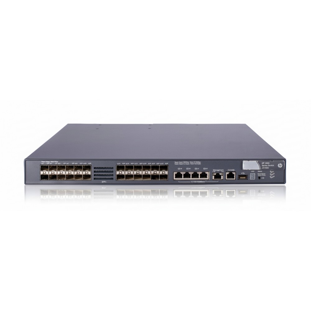 The HP JC102A switch is a fixed‑configuration Layer 2/3 device designed for network engineers deploying high‑bandwidth aggregation or top‑of‑rack (ToR) deployments. It provides 24 × 10 Gb SFP+ ports alongside 4 × 1 Gb RJ‑45 ports, enabling fibre‑backbone connectivity and RJ‑45 uplink compatibility. It supports full duplex on all ports and delivers up to 488 Gbps switching capacity with a forwarding rate of up to 363 Mpps, allowing high‑throughput, low‑latency traffic handling. The form‑factor is 1U rack mount, making it suitable for data centre, campus core/distribution or edge deployments where 10 Gb connectivity and IP routing/switching features are required. The unit supports IPv4/IPv6 dual‑stack and can integrate into existing network management frameworks via CLI, SNMP and web‑based tools.