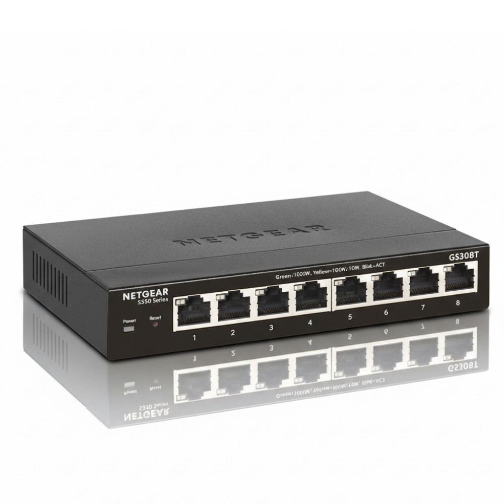 The NETGEAR GS308T-100NAS is an 8-port Smart (Layer 2) Gigabit Ethernet switch designed for small and medium businesses that need managed control with minimal complexity. It supports VLANs, ACLs, and link aggregation for reliable voice, video, and data traffic segmentation. The fanless metal housing ensures quiet operation in small office or branch environments. Configuration is handled through an intuitive web interface, SNMP, or NETGEAR Smart Control Center.
