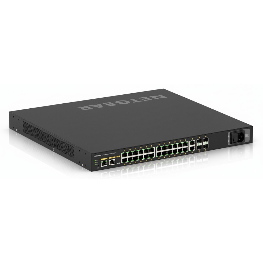 Designed for edge or branch deployments, this switch provides high-density PoE+ to power encoders, decoders, and wireless access points. With 24 Gigabit PoE+ ports and a 300W power budget, it supports a wide range of AV endpoints without requiring external power injectors. The inclusion of four SFP ports allows for flexible fiber uplinks to core switches or long-distance distribution. The hardware is optimized for quiet operation, featuring software-controlled fans that can be adjusted based on thermal load, making it suitable for noise-sensitive environments like conference rooms or recording studios. It integrates seamlessly with the Netgear Engage Controller for centralized management of multiple AV switches.