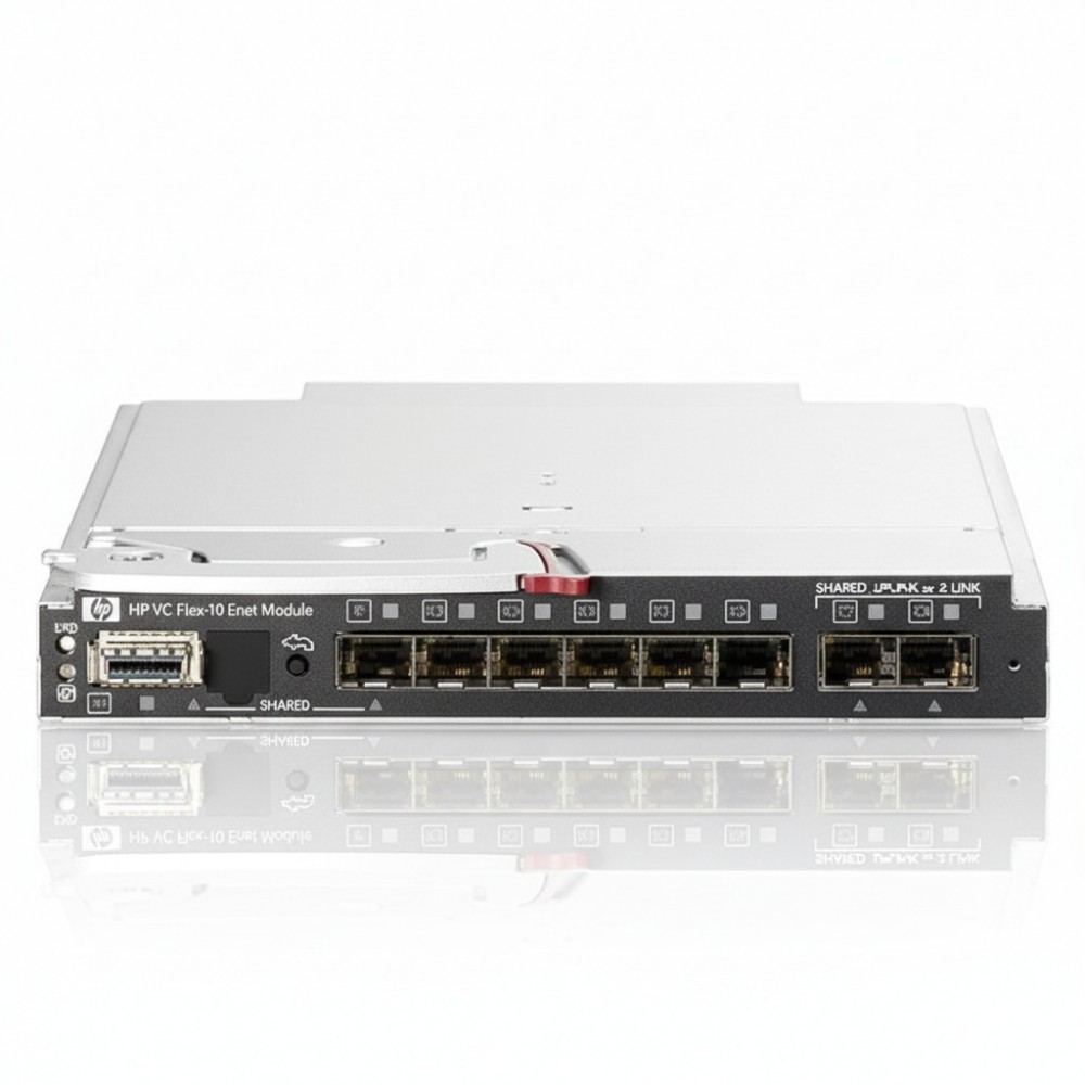 The HPE 639852-001 is a Virtual Connect Flex-10/10D module, an integral network interconnect for HPE c-Class BladeSystem enclosures. It is engineered for data center environments that require high-speed, adaptable network connectivity for blade servers. The primary role of this module is to consolidate and simplify the server edge, reducing the need for multiple traditional network interface cards and the associated cabling complexity by converging traffic over 10Gb connections. This module's core technology, Flex-10, allows administrators to partition each 10Gb network connection into four independent, physical function NICs, known as FlexNICs. Each FlexNIC's bandwidth can be precisely configured from 100 Mb/s up to 10 Gb/s to match specific application needs. This capability is invaluable in virtualized environments, enabling granular bandwidth control for different virtual machines without requiring additional hardware, which optimizes resource utilization and server performance. Designed as a plug-in module for the HPE BladeSystem c3000 and c7000 chassis, the device streamlines network management and simplifies server deployment. By abstracting the server-to-network connection, it allows administrators to add, move, or replace servers on the fly without having to reconfigure external network connections or SAN settings. Management is handled through a unified interface, supporting protocols like SNMP and CLI for seamless integration into existing network operations.