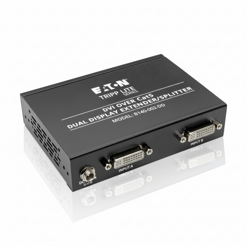 The Eaton Tripp Lite B140-002-DD is a high-performance 2-port DVI over Cat5/6 extender and splitter transmitter designed to distribute dual DVI video signals from two source computers to two sets of dual remote monitors. This solution is engineered to overcome the inherent distance limitations of standard DVI cabling, making it ideal for large-scale digital signage, educational facilities, corporate training rooms, and control centers where clear, consistent video delivery across extended distances is critical. It efficiently solves the challenge of replicating and extending high-resolution DVI video without signal degradation. This versatile device leverages cost-effective Cat5e/6 cabling to transmit DVI-D single-link signals, supporting impressive resolutions up to 1920 x 1200 (WUXGA) at 60Hz. When paired with passive remote receivers, it can extend a 1920 x 1200 signal up to 50 feet or a 1024 x 768 signal up to 100 feet. Utilizing active, powered receivers (sold separately), the extension capabilities expand significantly, delivering 1920 x 1200 video up to 150 feet and 1024 x 768 up to 200 feet. This flexibility ensures optimal video quality tailored to various deployment scenarios and display requirements. Designed for straightforward integration into existing IT infrastructure, the B140-002-DD features a robust metal housing and a plug-and-play setup that requires no software or drivers, streamlining deployment. It includes mounting hardware to facilitate versatile installation options, allowing for secure placement on walls, poles, or within a 19-inch rack. The unit's compatibility with all DVI video sources and computer operating systems, along with its HDCP compliance, ensures broad interoperability and content protection for diverse applications.