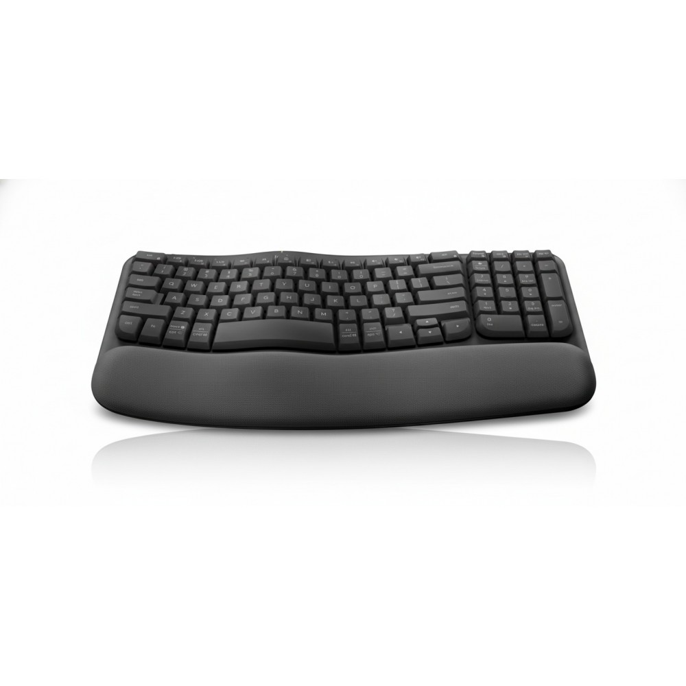 The Logitech 920-011898 Wave Keys is a wireless ergonomic keyboard designed to provide a more natural and comfortable typing experience, reducing muscle strain in the hands, wrists, and forearms. It is targeted at professionals and daily computer users in office or home-office environments who spend long hours typing and seek to improve their workstation ergonomics. The core problem it solves is the physical discomfort and pressure on the upper body associated with standard, non-ergonomic keyboards. This keyboard's signature feature is its wavy, curved keyframe that places the hands in a more natural, relaxed posture. This design element is paired with an integrated, cushioned palm rest made of three layers of memory foam, which offers significantly more wrist support and reduces pressure during extended use. This combination helps to minimize wrist extension and encourages a healthier typing posture, leading to greater comfort and productivity throughout the workday. The compact frame of the Wave Keys allows for a more ergonomic setup by enabling users to place their mouse closer to their body, resulting in a more natural shoulder position. It connects wirelessly via Bluetooth or the included Logi Bolt USB receiver, offering the flexibility to pair with and easily switch between up to three devices, such as a laptop, tablet, and phone, using the Easy-Switch keys. Management and customization are handled through the Logi Options+ software.
