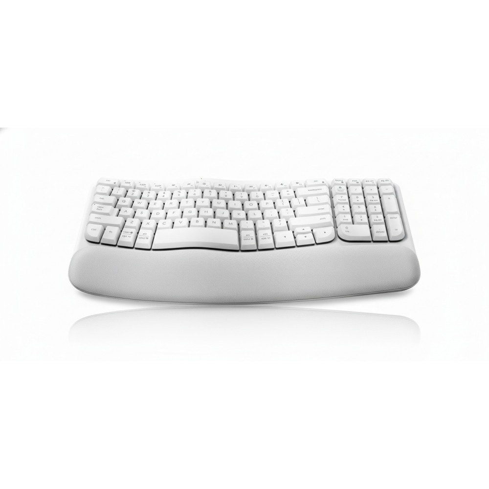 The Logitech Wave Keys, part number 920-012275, is a wireless ergonomic keyboard designed to deliver a more comfortable and natural typing experience throughout the workday. It is engineered for individuals in office and home-office environments who spend significant time typing and aims to reduce the muscle strain often associated with standard keyboards. By placing the user's hands, wrists, and forearms in a more relaxed posture, it directly addresses the physical discomfort that can impede productivity. This keyboard's core technology is its distinctive wave-shaped frame coupled with a cushioned palm rest. This scientifically-backed ergonomic design feels instantly familiar while promoting a healthier typing alignment. The integrated palm rest features three layers of memory foam, providing continuous, pressure-reducing support for your wrists, which is a critical benefit during long periods of data entry, programming, or content creation. Designed for a modern, clutter-free workspace, the Wave Keys is compact and connects wirelessly via Bluetooth or the included Logi Bolt USB receiver. Its Easy-Switch technology allows seamless toggling between up to three different devices—such as a laptop, tablet, or phone—with the simple press of a button. The device is managed through the Logi Options+ software, which allows for powerful customization of shortcuts to streamline specific workflows.
