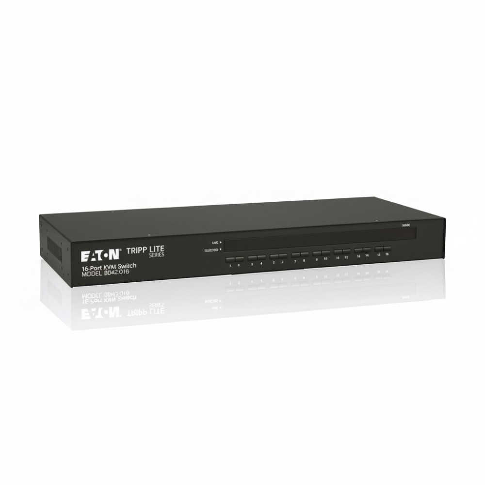 The Eaton B042-016 Tripp Lite 16-Port KVM Switch offers a robust, centralized management solution for diverse IT environments, enabling administrators to control up to 16 computers from a single console. Designed for server rooms, data centers, and enterprise campuses, this rack-mountable device streamlines operations by eliminating the need for multiple keyboards, monitors, and mice, thereby reducing equipment clutter and enhancing workflow efficiency. It addresses the common challenge of managing a growing number of servers without expanding the physical footprint of the administrative workstation. This KVM switch integrates seamlessly into existing infrastructures, providing broad compatibility with various operating systems and supporting both USB and PS/2 keyboard/mouse connections through its P780-Series combo KVM cable kits. The advanced on-screen display (OSD) simplifies navigation and server selection, allowing for intuitive control of connected systems. For expanding data centers or growing server deployments, the B042-016 supports daisy-chaining, enabling management of up to 256 computers by cascading up to 15 additional B040/B042-Series KVM switches. This scalability ensures that your KVM solution can evolve with your infrastructure's demands. Packaged in a compact 1U rack-mount form factor, the Eaton B042-016 is designed for easy installation in standard 19-inch racks or cabinets, including all necessary mounting hardware. Management is flexible, offering options via the OSD, front-panel pushbuttons, or keyboard hotkey commands, catering to different operational preferences. Its secure design includes password protection, safeguarding against unauthorized access to connected servers and critical data.