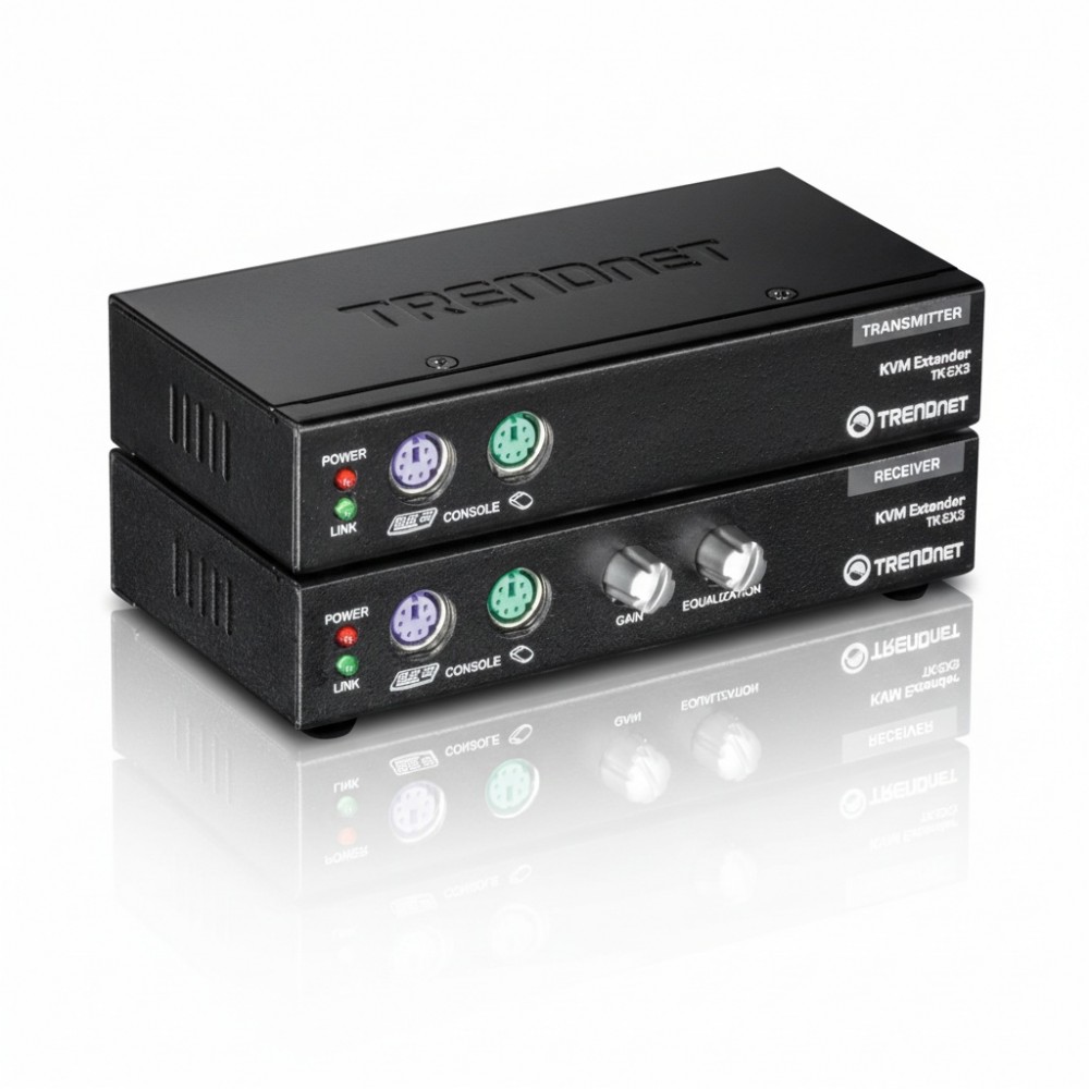 The TRENDnet TK-EX3 is a dedicated KVM Extension Kit designed to give administrators direct keyboard, video, and mouse control over a computer or server from up to 150 meters away. It is an ideal solution for environments where systems are secured in a dedicated server room or data closet, but frequent access is required from a more convenient location like an office or control desk. By transmitting signals over a single, standard Cat5e/6 Ethernet cable, this kit eliminates the need for bulky, signal-degrading long-distance VGA and USB cables, solving the critical challenge of remote physical access. This kit consists of a local transmitter unit and a remote receiver unit, creating a point-to-point hardware link that requires no software or driver installation. A key technical feature is the inclusion of manual adjustment dials on the remote unit for both Gain and Equalization. This allows an operator to fine-tune the video signal, compensating for potential degradation over long cable runs and ensuring the sharpest possible image quality. The system supports a high-resolution UXGA display up to 1600 x 1200, providing the clarity needed for detailed server management tasks. For deployment, the compact transmitter unit connects directly to the source computer or an existing KVM switch, offering flexible input support for both USB and legacy PS/2 peripherals. The receiver unit is placed at the operator's workstation, providing outputs for a VGA monitor and a PS/2 keyboard and mouse. This simple, robust architecture makes the TK-EX3 a reliable tool for improving workflow efficiency and reducing the time technicians spend moving between their desk and the IT infrastructure they manage.