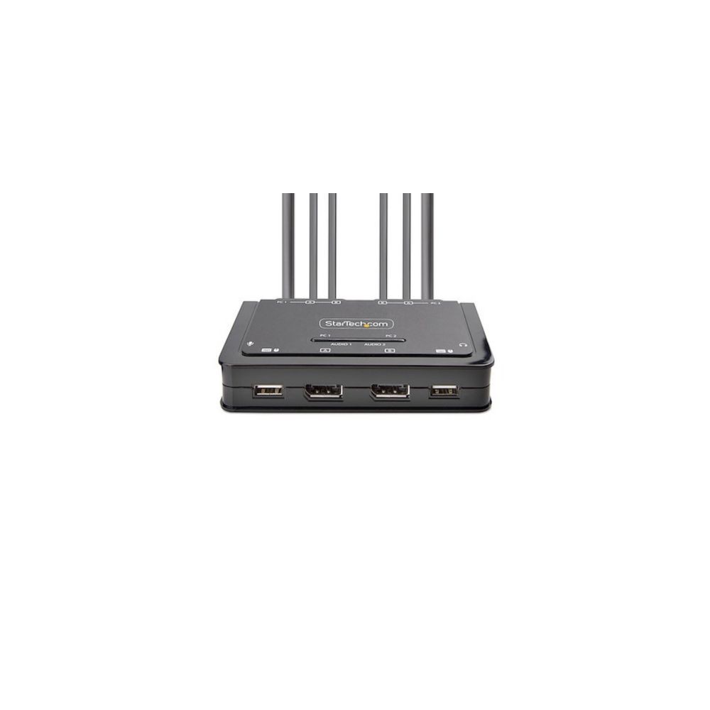 The StarTech C2-DD46-UA2-CBL-KVM is a compact, all-in-one KVM solution designed for users who need to switch between two USB-C enabled laptops or tablets while sharing a single workstation setup. It addresses the desktop clutter common in multi-device environments by integrating the host cables directly into the unit, providing a streamlined "plug-and-play" experience for home offices and mobile professionals.