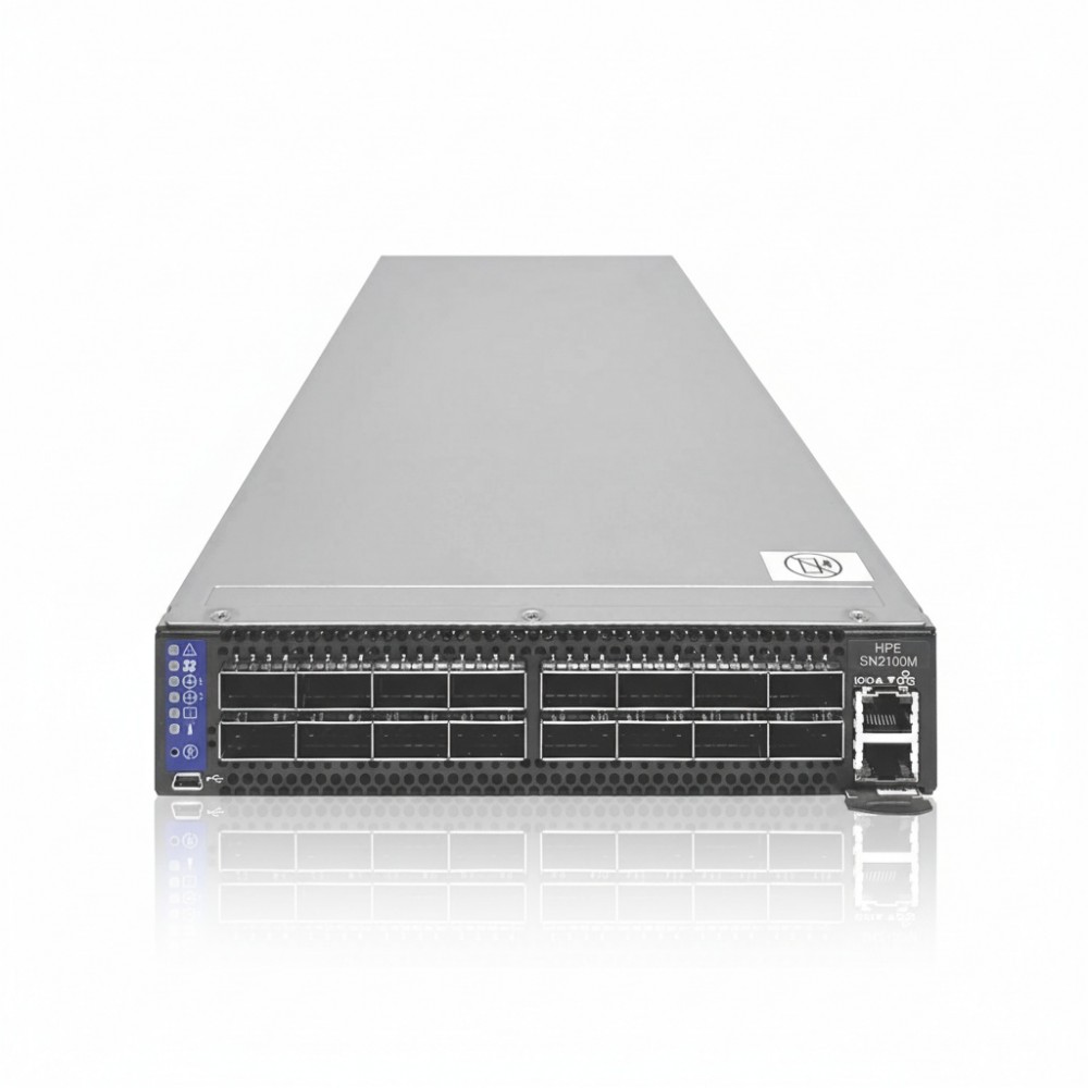 The HPE Q2F24A is a high‑performance, half‑width 1U switch in the M‑series SN2100M family. It offers 8 QSFP28 ports that support native 100 GbE and can be configured for breakout speeds, enabling flexible deployment for data center, storage, and top-of-rack scenarios. Built with NVIDIA Spectrum ASIC architecture, it delivers ultra‑low latency and a high-capacity switching fabric. The device supports redundant, hot‑swappable power supplies and fans for high availability and continuous operation.