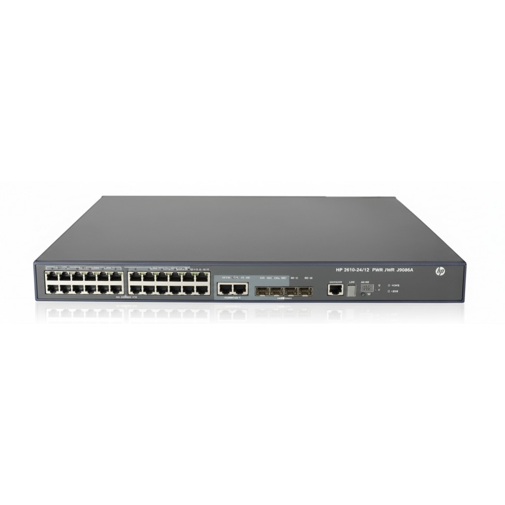 The HPE JG301A is a versatile Layer 3 Fast Ethernet access switch, engineered for the enterprise network edge. It provides secure, resilient, and intelligent performance for businesses needing to support converged applications, mobility, and new technologies. This device excels in environments requiring robust security, traffic prioritization, and high-availability for voice, video, and data traffic, making it a suitable choice for deployment in branch offices or campus networks. At its core, the switch leverages advanced Layer 3 routing protocols and security features to ensure reliable and protected connectivity. With 24 10/100 PoE+ ports, it delivers both data and power over a single Ethernet cable to devices like IP phones, wireless access points, and surveillance cameras. The inclusion of four SFP-based Gigabit Ethernet ports provides flexible, high-speed fiber uplinks to the network core, enhancing scalability and performance. Designed for operational efficiency, the JG301A fits into a standard 1U rack-mountable form factor. Management is streamlined through a comprehensive suite of tools, including a command-line interface (CLI), a web-based browser interface, and SNMP support. These management options allow for precise control and visibility, simplifying network administration and reducing the total cost of ownership within complex IT infrastructures.