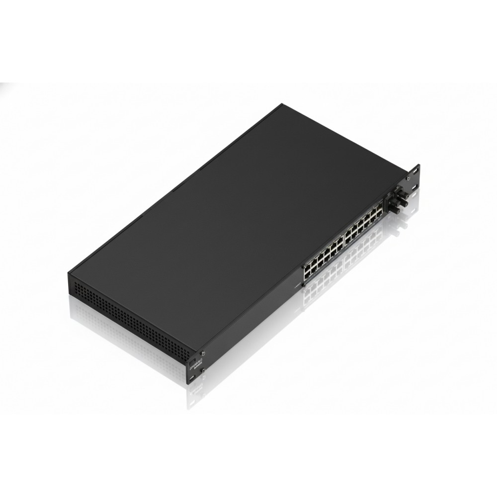 • Equipped with 24 Gigabit Ethernet ports and 4 SFP ports for fiber optic uplinks