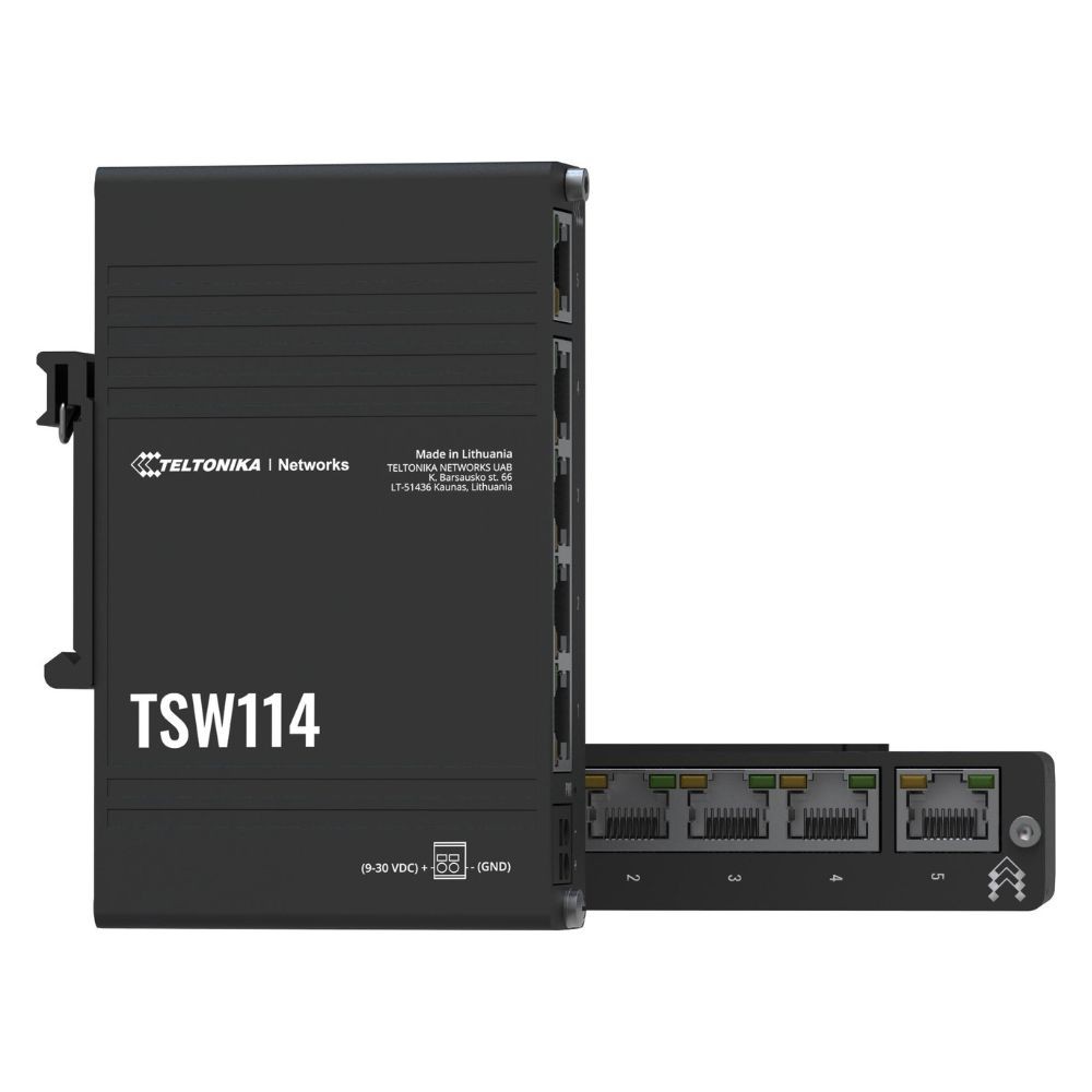 Teltonika TSW114000001 is an unmanaged Gigabit Ethernet switch suited for industrial and automation networks requiring basic high‑speed wired connectivity. It offers five 10/100/1000 Mbps RJ45 ports and supports DIN‑rail mounting for compact installation. The rugged aluminium housing and wide input voltage range make it suitable for harsh environments and edge cabinets. It operates reliably across a broad temperature range for stable network links.