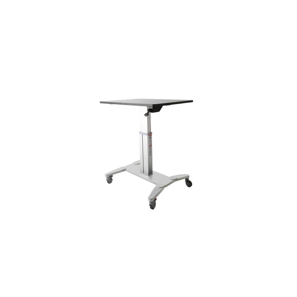 The workstation features a gas-spring height adjustment system with a range of approximately 31.7″ to 45″, enabling quick transitions between seated and standing positions without tools. A large 24″ × 31.5″ work surface supports laptops, keyboards, and light equipment, while lockable casters allow controlled mobility across rooms.