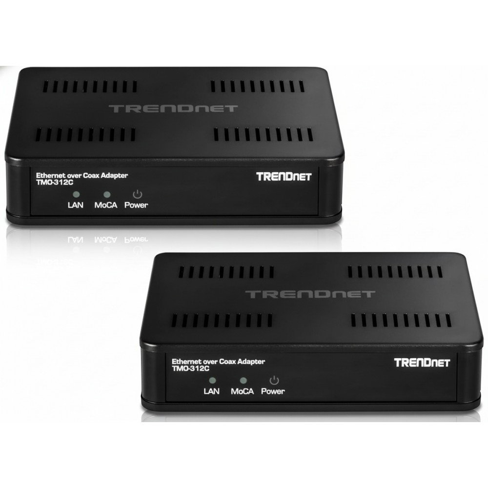 The TRENDnet TMO-312C2K is a two-unit kit of MoCA 2.5 adapters designed for engineers and IT professionals who need to extend Ethernet connectivity over existing coaxial cabling. It enables up to 2.5 Gbps net throughput using bonded MoCA channels, bridging Ethernet-capable devices in locations where running new cabling would be impractical. Each adapter provides one RJ-45 Gigabit LAN port and one F-type female coax port, and supports networks of up to 16 MoCA nodes. It fits deployment environments such as campus buildings, distributed networks or multi-dwelling units where coax is already present, and integrates into MoCA-compliant infrastructure (backward compatible with MoCA 2.0/1.1/1.0). The TMO-312C2K works alongside standard Ethernet switches and routers and requires minimal setup — plug-and-play for converting coax segments into Ethernet links.