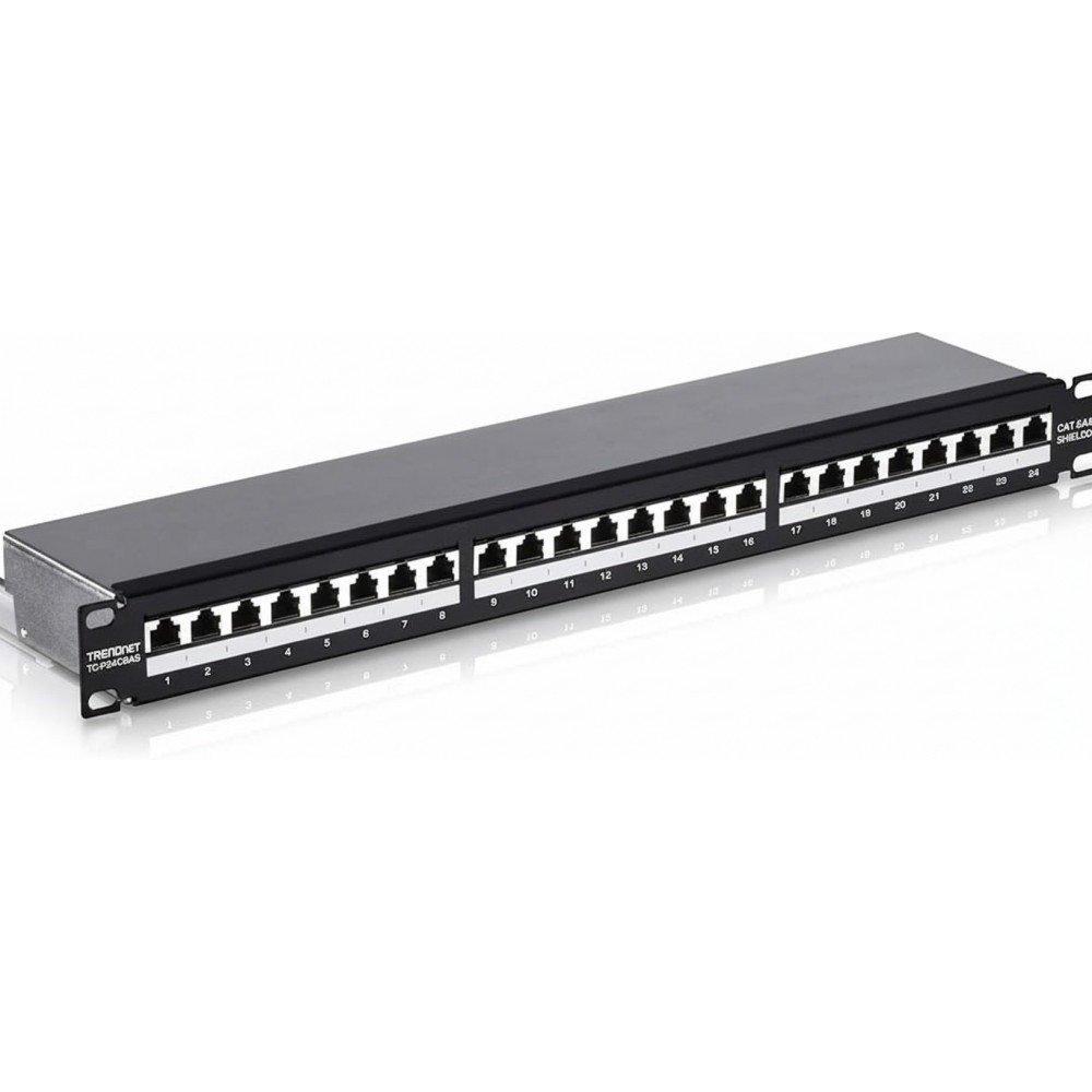 The TRENDnet TC-P24C6AS is a 24-port Cat6A shielded patch panel designed for high-speed 10 Gigabit copper Ethernet network applications. This passive network component serves as a central termination point for horizontal cabling infrastructure in a server room or data closet, providing a clean and organized management solution. It is engineered to support Cat5e, Cat6, and Cat6A cabling standards, ensuring backward compatibility while preparing the network for future bandwidth demands. This patch panel's primary function is to mitigate signal degradation from external electromagnetic interference (EMI) and crosstalk, which is critical in dense, high-speed network environments. The shielded design, featuring a sturdy metal housing, ensures data integrity and peak performance for 10GBASE-T transmissions. This level of signal protection is essential for maintaining stable, reliable connections between switches and endpoint devices. Built for standard 19-inch racks, the TC-P24C6AS occupies a single rack unit (1U) of space. For installation, the unit features 110 IDC type terminal blocks and clear, color-coded labeling for both T568A and T568B wiring schemes, simplifying the termination process for network technicians. An integrated cable management cover plate aids in organizing connections and reducing cable clutter for a professional installation.