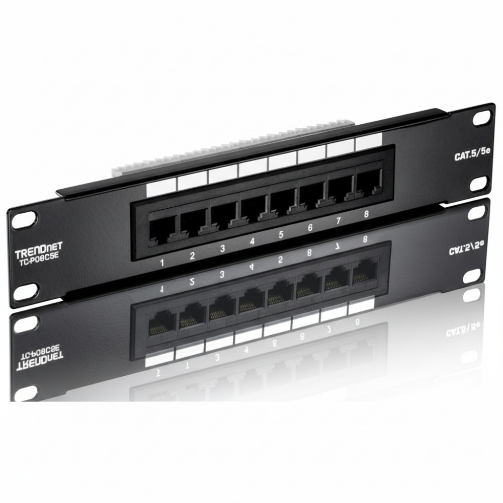 The TRENDnet TC-P08C5E is a reliable and straightforward 8-port unshielded patch panel designed for Category 5e network cabling. It is engineered to provide a centralized termination point for network drops in home, small office, and small to medium-sized business (SMB) environments. This unit solves the common problem of cable disorganization at the network core by enabling a clean, labeled, and easily manageable connection hub for horizontal cabling runs. Its compact 10-inch form factor is specifically suited for installations where a full-sized 19-inch rack is not practical, such as in wall-mounted enclosures or small communications closets. This patch panel offers a dependable 100 MHz connection across all 8 Gigabit RJ-45 Ethernet ports, ensuring consistent performance for data, voice, and video applications over a Cat5e infrastructure. The unit features color-coded labeling for both T568A and T568B wiring standards, which simplifies the termination process and reduces installation errors. Technicians can quickly and accurately punch down connections using standard 110 IDC punch-down tools. The clear labeling and organized port layout are crucial for efficient troubleshooting and future network modifications. For deployment, the TC-P08C5E is designed for either wall mounting or installation in a 10-inch network rack. Included cable management holders and ties help to secure cabling and reduce strain on the terminated connections, contributing to long-term network stability. A writable surface above each port allows for clear identification of each network drop, a critical feature for effective infrastructure management. This patch panel serves as a foundational component for building a structured and professional-looking cabling system in smaller-scale deployments.