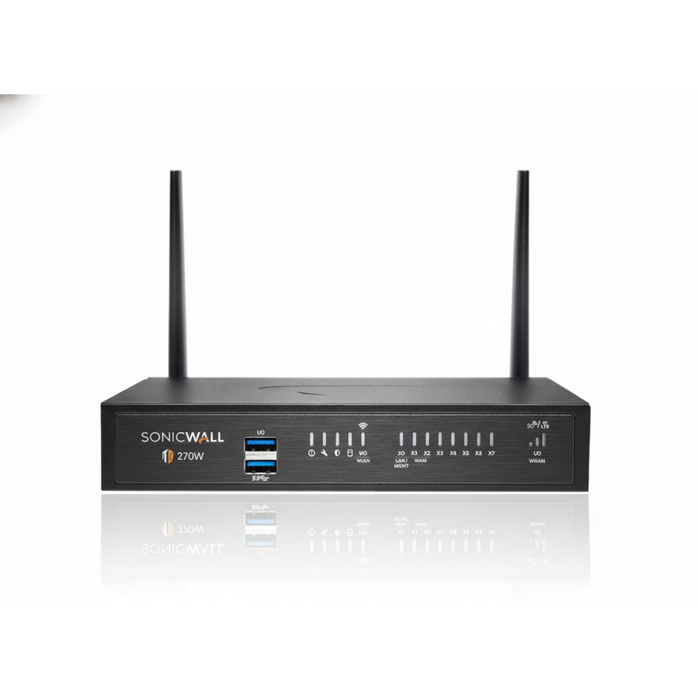 The SonicWall TZ270W is a next-generation firewall designed to provide robust security for home offices, small to medium-sized businesses, and lean branch locations. This appliance integrates enterprise-grade threat protection with Wi-Fi 5 capabilities, delivering a comprehensive security solution without the complexity often associated with larger systems. It effectively addresses modern cybersecurity challenges by defending against advanced threats, including ransomware and zero-day exploits, ensuring business continuity and data integrity. Engineered with SonicOS 7.0, the TZ270W leverages real-time deep memory inspection and multi-engine sandboxing through Capture Advanced Threat Protection (ATP) to identify and block unknown threats. Its Reassembly-Free Deep Packet Inspection (RFDPI) engine provides thorough packet analysis, ensuring that malicious content is detected and mitigated before it can impact the network. This advanced threat prevention capability is crucial for environments that require high-performance security without compromising network throughput. Deployment and management of the TZ270W are streamlined through features like Zero-Touch Deployment, enabling rapid rollout across multiple locations with minimal IT intervention. The appliance integrates firewalling, switching, and wireless functionalities into a compact form factor suitable for both desktop and rack-mountable installations. It includes eight 1 Gigabit Ethernet ports for flexible network segmentation and connectivity, alongside dual USB 3.0 ports for expanded options, making it a versatile foundation for secure and scalable network infrastructures.