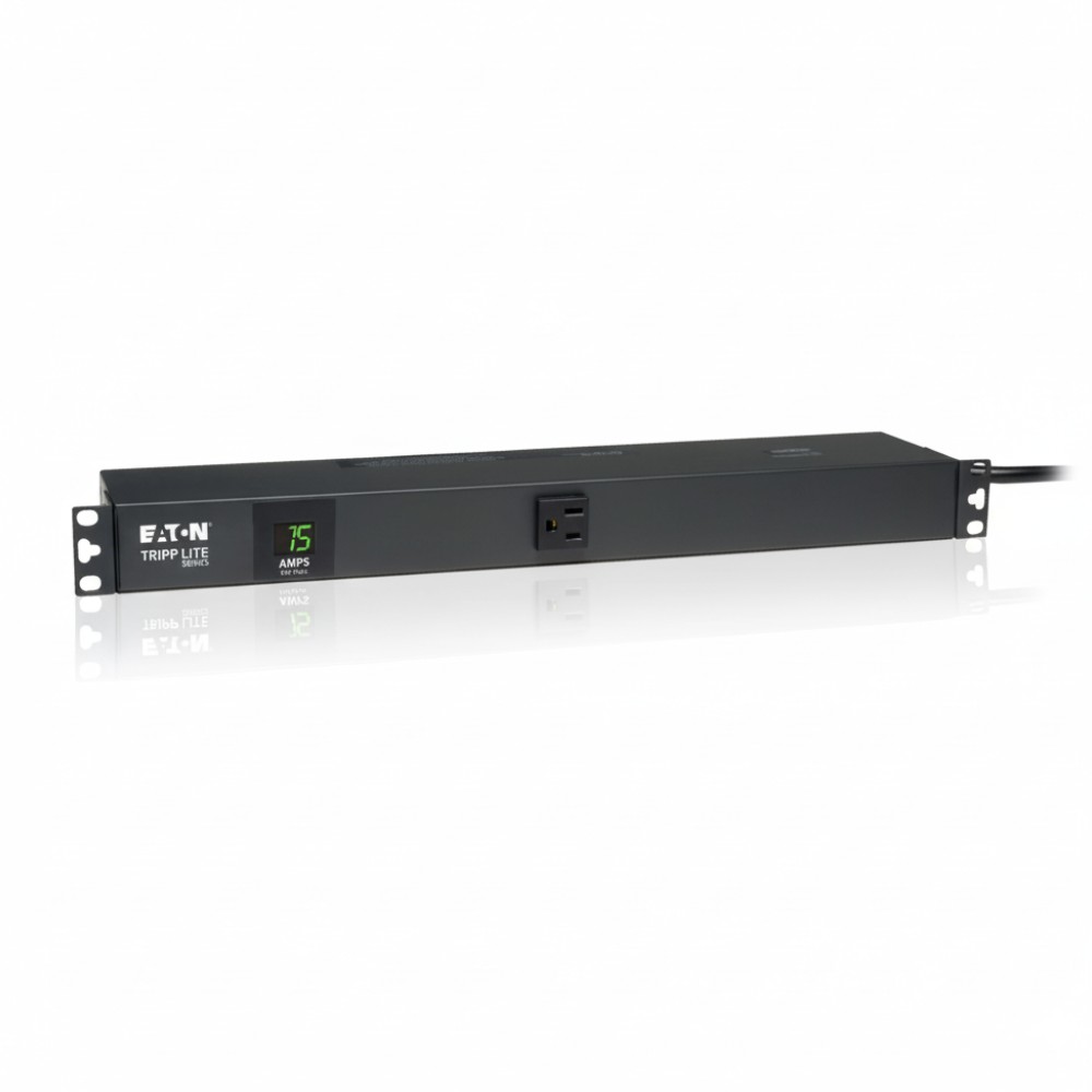 The Eaton PDUMH15 is a local-metered power distribution unit (PDU) designed for rack-mount installations where currents need to be monitored but remote network‐management is not required. It supports a 100-127 V single-phase input, de-rated to 12 A continuous (≈1.44 kW) for safe use in 15 A rack circuits. It features a 15-ft (4.57 m) cord with NEMA 5-15P plug, and delivers power to 13 NEMA 5-15R outlets (1 front-facing, 12 rear) in a 1U horizontal chassis. The front-panel digital meter shows load current in real time, enabling capacity planning and avoiding circuit overloads. The housing is metal, reversible for left or right cord exit, and shallow-depth (≈4.5″/11.4 cm) so it fits in tight rack rear spaces or shallow cabinets. Mounting flanges support 2-post/4-post racks, as well as wall-mount or under-counter installations. This unit is ideal for network closets, enterprise racks or edge-data deployments where you want good outlet density, local current visibility and minimal rack-space consumption without full network-managed PDU expense.