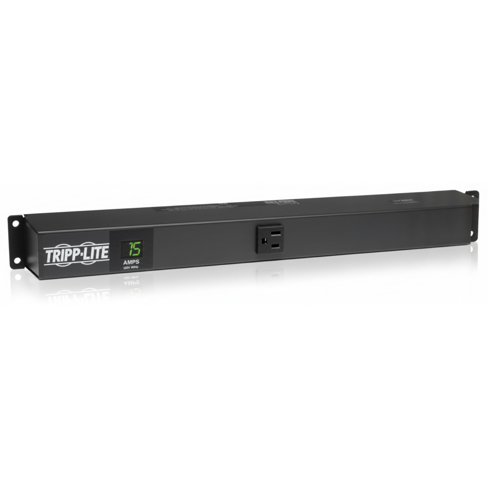 The PDUMH15-6 from Tripp Lite (an Eaton company) is a single-phase local metered rack power distribution unit designed for IT infrastructure deployments that require both outlet density and load monitoring. It offers 13 NEMA 5-15R output receptacles and supports up to 12 A continuous load, helping engineers prevent circuit overload in rack environments. With a 6-ft (1.83 m) NEMA 5-15P input cord, it enables straightforward connection to a standard 100-127 V branch circuit. The unit mounts horizontally in a 1U rack-space and supports installation in 2-post or 4-post racks, or under-counter, making it suitable for data center, campus, branch, or edge infrastructure. It features a built-in digital ammeter for local current monitoring and is explicitly designed to integrate into Eaton and Tripp Lite rack power systems. The metal housing includes mounting flanges and grounding provisions to comply with professional rack installations.