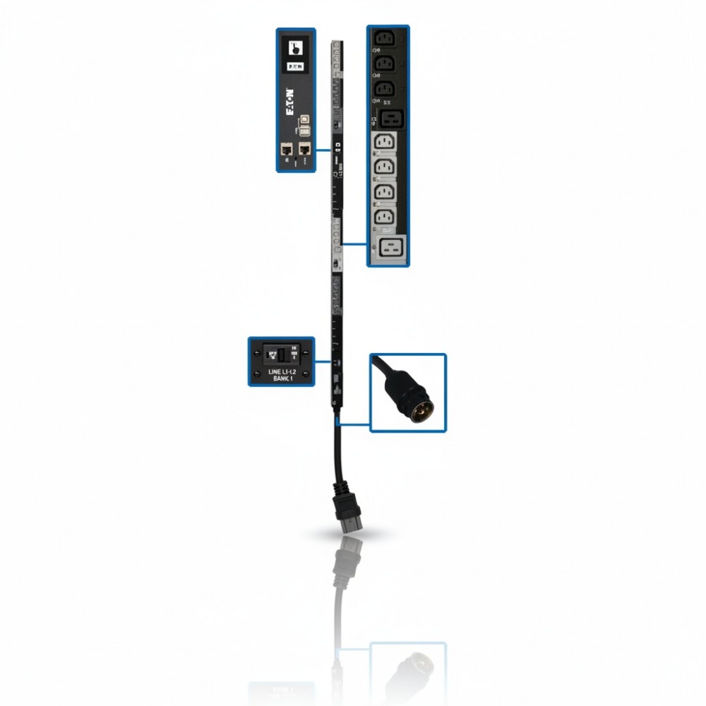 The Eaton PDU3EVS6L2130 is a high-performance, 3-phase switched Power Distribution Unit (PDU) designed for advanced power management in demanding IT environments. This 0U vertical rack-mountable solution is ideal for data centers, server rooms, and network closets requiring precise control and monitoring of power distribution. It effectively addresses the challenge of managing network-grade power, enabling IT professionals to remotely control and optimize power to connected equipment, thereby minimizing downtime and reducing operational costs. Equipped with a sophisticated LX Platform network interface, this PDU facilitates comprehensive remote management via a Java-free, HTML5-based secure web browser, SNMP, Telnet, or SSH. Users can individually turn on, turn off, reboot, or lock out power to any of its 30 outlets, significantly enhancing control over critical infrastructure. The unit also features a color touchscreen LCD that provides real-time data, including IP address, input current levels per phase, and output current per load bank with billing-grade ±1% accuracy. This granular monitoring capability supports efficient load balancing and helps prevent overloads that can impact system uptime. With its efficient design, the PDU integrates seamlessly into various IT infrastructures, consuming no rack U-space due to its 0U vertical mounting form factor. It connects to a compatible 3-phase AC power source, generator, or protected UPS via a NEMA L21-30P input plug and a 6-foot cord. The PDU supports both IPv4 and IPv6 protocols and allows for flexible network configuration via DHCP or manual IP assignment, ensuring versatile deployment and simplified management within complex network architectures.