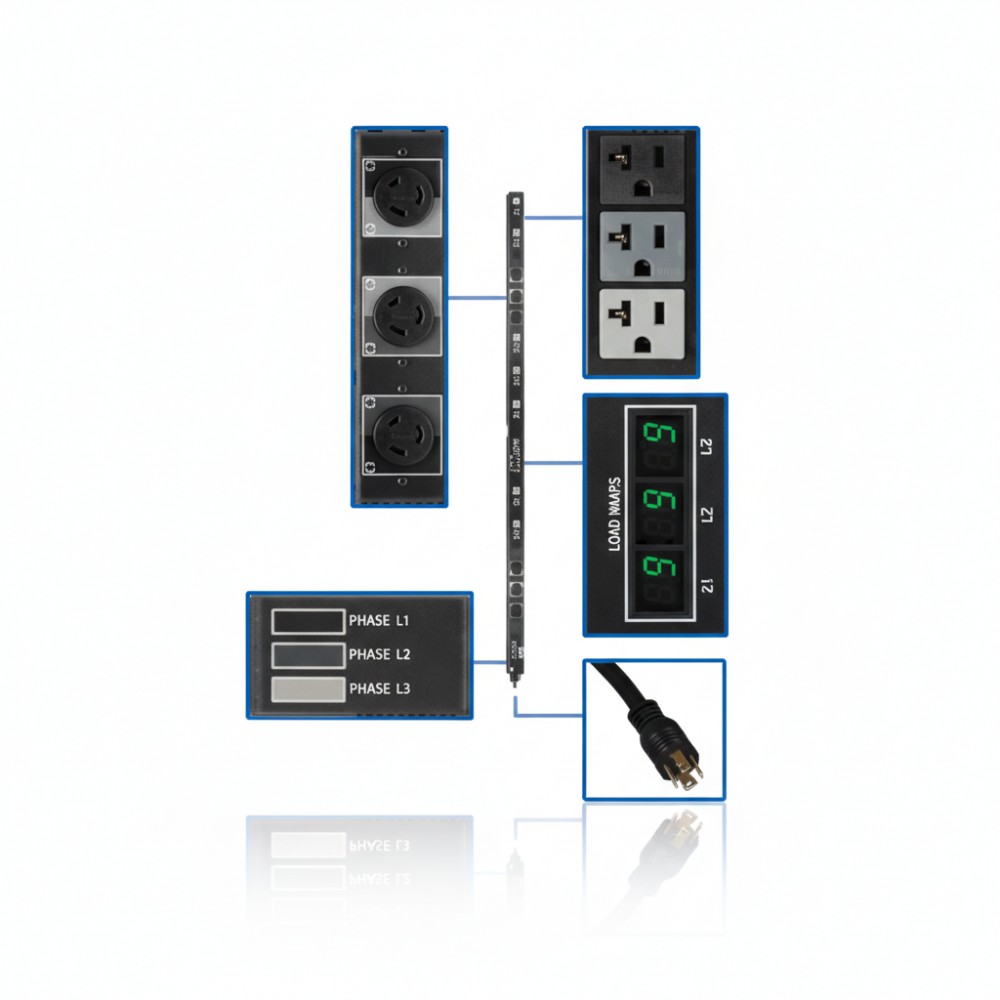The Eaton Tripp Lite Series PDU3MV6L2120B is a robust 3-phase metered Power Distribution Unit designed for high-density network and data center environments. It provides reliable and precise power distribution, ensuring optimal performance for critical IT infrastructure. This PDU addresses the challenge of managing diverse power requirements by offering a flexible array of outlets and real-time monitoring capabilities, essential for maintaining uptime and optimizing energy usage in complex setups. Engineered to distribute 5.7kW of power from a single NEMA L21-20P input, this PDU offers comprehensive output options with 21 NEMA 5-15/20R (120V) and 6 NEMA L6-20R (208V) outlets. Its key feature is the integration of three built-in digital meters, which provide immediate, per-phase current level reporting. This granular monitoring empowers IT professionals to precisely balance loads across the three phases, preventing overloads and maximizing the PDU's capacity without risking connected equipment. Ideal for rack enclosures, the PDU3MV6L2120B features a 0U vertical rackmount form factor, which minimizes rack space consumption and promotes efficient airflow. Its toolless button-mount installation simplifies deployment, reducing installation time and labor costs. The rugged all-metal housing ensures durability in demanding operational conditions, making it a dependable solution for power distribution and management in any professional IT setting.
