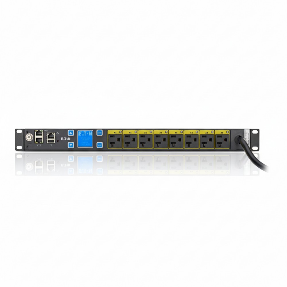 The Eaton EMAT09-10 is a 1U managed rack Power Distribution Unit (PDU) engineered to deliver robust and intelligent power management within modern IT environments such as data centers, server rooms, and network closets. This device efficiently distributes single-phase 120V AC power to critical rack-mounted equipment, while addressing the challenge of monitoring and controlling energy consumption at the outlet level. Its managed capabilities provide precise insights and control over power usage, which is essential for optimizing operational efficiency and preventing downtime in dynamic IT infrastructures. This PDU integrates key technologies designed for advanced power oversight. It features individual outlet switching, allowing administrators to remotely power cycle or control individual outlets to reboot hung servers or network devices without physically entering the data center. Furthermore, its high-accuracy metering provides real-time data on current, voltage, and power factor, enabling informed decisions for load balancing and capacity planning. This level of granular data helps IT managers avoid over-provisioning and ensures that power resources are utilized effectively, translating directly into optimized energy costs and improved infrastructure reliability. Designed for seamless integration, the EMAT09-10 occupies a minimal 1U of rack space, making it an ideal solution for high-density rack configurations where space is at a premium. Its network-enabled management interface, supporting Ethernet and RS-232, facilitates remote monitoring and control through standard web browsers or integration with Eaton's power management software. This centralizes power infrastructure management, simplifying operations and providing a comprehensive view of power status across the enterprise, ultimately enhancing proactive problem resolution and system uptime.