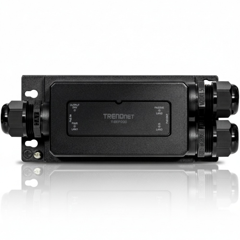 The TRENDnet TI-BEP200 is an industrial-grade, 2-port gigabit Power over Ethernet (PoE) extender designed for harsh environments. Its primary purpose is to solve the 100-meter distance limitation of standard Ethernet, allowing for the deployment of IP cameras, wireless access points, and other PoE devices in remote outdoor locations without needing a local power source. This device takes a single high-power PoE++ (802.3bt) input and extends both data and power for an additional 100 meters. Engineered for reliability, this extender is built with a rugged IP67-rated metal housing, making it fully protected against dust, rain, and other challenging weather conditions. It features a wide operating temperature range of -40° to 75° C, ensuring consistent performance in extreme heat or cold. The unit is entirely powered by the incoming PoE connection, which eliminates the complexity and cost of running separate electrical wiring, streamlining field installations. For maximum network flexibility, the TI-BEP200 features one gigabit PoE++ input port, one PoE+ (802.3at) output port, and one passive PoE output port, allowing it to power up to two devices simultaneously. The wall-mountable chassis provides secure installation options. A key capability is the ability to daisy-chain up to four extenders, pushing the total network reach to an impressive 500 meters from the source, making it an ideal solution for large perimeters, campuses, and industrial facilities.