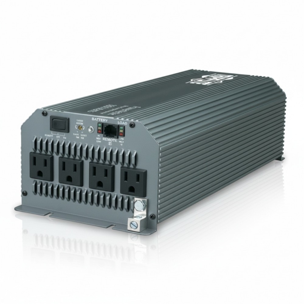 The Eaton PV1800HF is a robust, compact power inverter engineered to deliver reliable AC power from a 12V DC source, making it an essential component for mobile and remote operations. This unit efficiently converts 12V DC battery power into 120V AC, providing a continuous output of 1800 watts to power essential equipment where standard wall outlets are unavailable. Ideal for equipping service vehicles, work trucks, or field offices, the PV1800HF addresses the critical need for consistent power, enabling professionals to run office equipment, power tools, and other AC-powered devices far from fixed electrical grids. Engineered for demanding environments, this PowerVerter inverter features a sturdy all-metal housing and an integrated cooling fan to ensure optimal thermal performance and extended service life. It is designed to handle momentary high-power demands with a 3600-watt peak output capacity, providing the necessary surge for starting power tools or other inductive loads. The PV1800HF incorporates high-efficiency operation, which is crucial for conserving battery life and prolonging run times, directly translating into increased productivity and reduced downtime in the field. Deployment is straightforward, utilizing nut-and-bolt style DC terminals for a secure hardwire connection to a 12V battery system in a vehicle or other mobile setup. With four standard NEMA 5-15R outlets, the PV1800HF can support multiple devices simultaneously, making it suitable for a complete mobile office or a comprehensive set of job-site tools. Its integrated diagnostic LEDs and audible alarms for low battery voltage or overload conditions ensure proactive power management, safeguarding connected equipment and the power source.