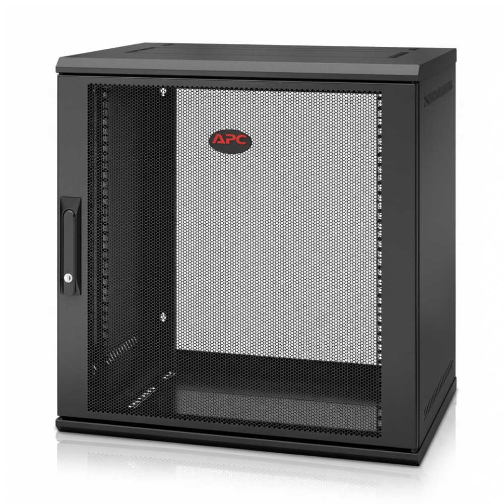 The APC AR112SH4 is a 12U wall-mount rack cabinet crafted for edge, telecom closets, and network closets where floor space is unavailable. It supports equipment depths up to 400 mm and carries a 200 lb (~90.7 kg) static load rating. The enclosure ships fully assembled, includes a reversible single-hinge locking door, and features ½U knockouts at top and bottom to streamline cable routing and accessory integration. It’s a solid option for mounting switches, patch panels, compact UPS units, or servers overhead on walls.