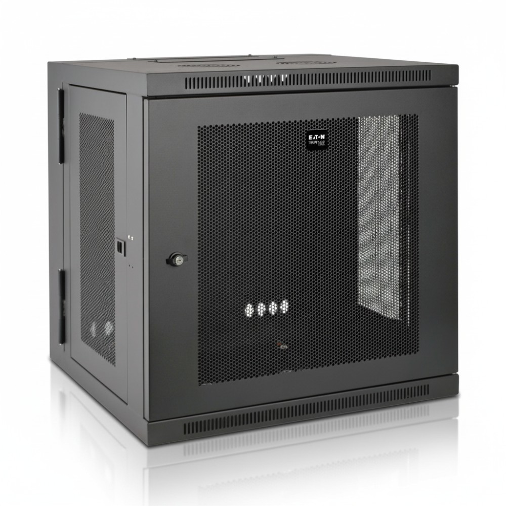 The Eaton SRW12USDP is a 12-unit high (12 U) wall-mount rack enclosure designed for compact spaces such as wiring closets, branch-office IT rooms or retail network closets. It supports standard 19-inch rack-mount equipment and is built with a “UPS-depth” internal mounting depth of up to 24.5 in (≈622 mm) to accommodate deeper gear such as short UPS units, battery packs or larger network devices. The enclosure is constructed of heavy-duty steel, features a black powder-coat finish, and includes a hinged back panel that swings away from the wall for convenient rear cabling and maintenance. It is rated to support a maximum load of 200 lb (≈90.7 kg), making it suitable for typical switch stacks, small server nodes or edge-site equipment.