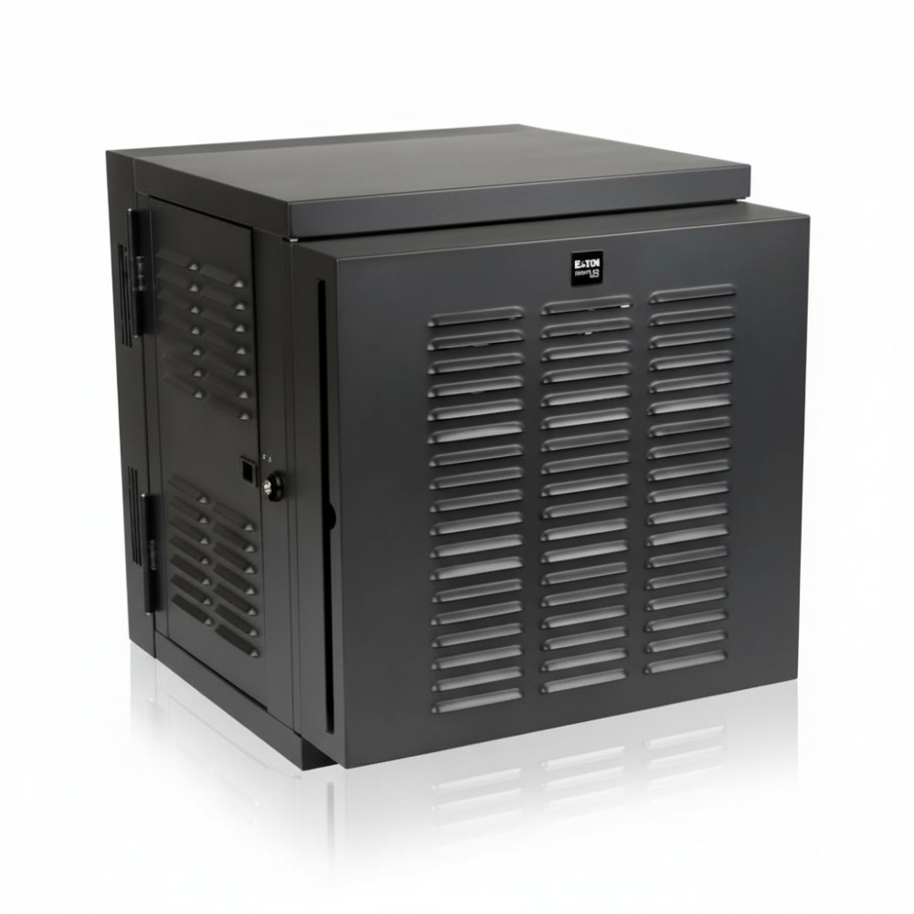 The Eaton SRW12USNEMA SmartRack 12U NEMA 12 Switch-Depth Wall-Mount Rack Enclosure Cabinet offers robust protection for critical IT equipment in challenging environments. Engineered to safeguard against dust, dirt, drips, and splashes, this enclosure is ideal for industrial settings such as factories, construction sites, utility plants, and distribution centers where sensitive network components require superior environmental shielding. Its design ensures operational reliability for switches, patch panels, and other 19-inch rack-mount gear by preventing contamination and maintaining stable conditions. This 12U enclosure incorporates a built-in air filter, louvered vents, and four high-performance intake fans to facilitate filtered airflow, effectively managing thermal loads and preventing overheating. The NEMA 12 (IP54) protection rating, combined with sealed gaskets around door frames and brush-strip cable access points, ensures a tightly controlled internal environment. This meticulous engineering extends equipment lifespan by mitigating the risks associated with harsh ambient conditions. Designed for flexible deployment in spaces with limited floor availability, the SRW12USNEMA mounts securely to a wall. Its hinged cabinet allows the entire enclosure to swing open, providing convenient rear access to equipment and cabling for simplified installation and maintenance without disrupting operations. The reversible front door and removable side panels, all lockable, enhance physical security, preventing unauthorized access and tampering. This fully assembled unit streamlines deployment, making it an efficient solution for protecting network infrastructure where environmental resilience is paramount.