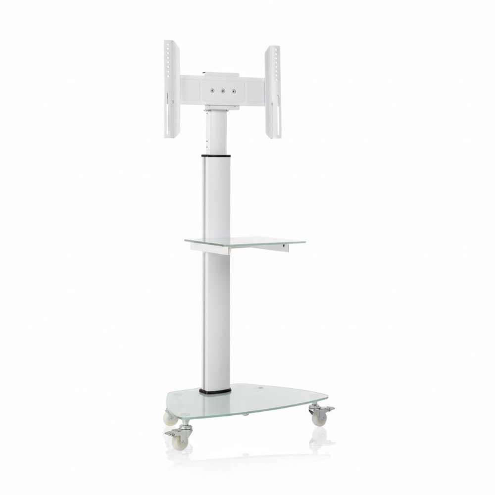 The Eaton Tripp Lite DMCS3770SG75W is a robust and adaptable Premier Rolling TV Cart designed to enhance collaboration and dynamic content sharing across various professional environments. This mobile display solution is engineered to transport large flat-panel televisions, interactive whiteboards, or touchscreen monitors, making it ideal for offices, conference rooms, classrooms, and healthcare facilities. It addresses the need for flexible display placement, allowing organizations to maximize resource utilization and adapt to evolving presentation requirements efficiently. Constructed from heavy-duty steel and aluminum, the DMCS3770SG75W cart provides a durable and stable platform for displays ranging from 37 to 70 inches. It supports a substantial maximum load capacity of 175 pounds, ensuring secure mounting for a wide range of devices. The cart features a height-adjustable display mount, allowing the screen to be positioned anywhere from 65.7 to 84.6 inches above the floor, ensuring optimal viewing angles for diverse audiences and room configurations. VESA-compliant mounting standards further guarantee broad compatibility with popular display models, including patterns up to 600x400. Ease of deployment and management is central to the DMCS3770SG75W's design. Equipped with three-inch locking swivel casters, the cart moves smoothly across various floor surfaces and can be securely locked into position when stationary, preventing accidental movement during presentations. An integrated frosted glass shelf and base offer convenient space for peripherals such as laptops, webcams, or Blu-ray players, supporting an organized and clutter-free setup. Additionally, integrated cable management features help route and conceal cables, contributing to a professional appearance and reducing potential trip hazards.