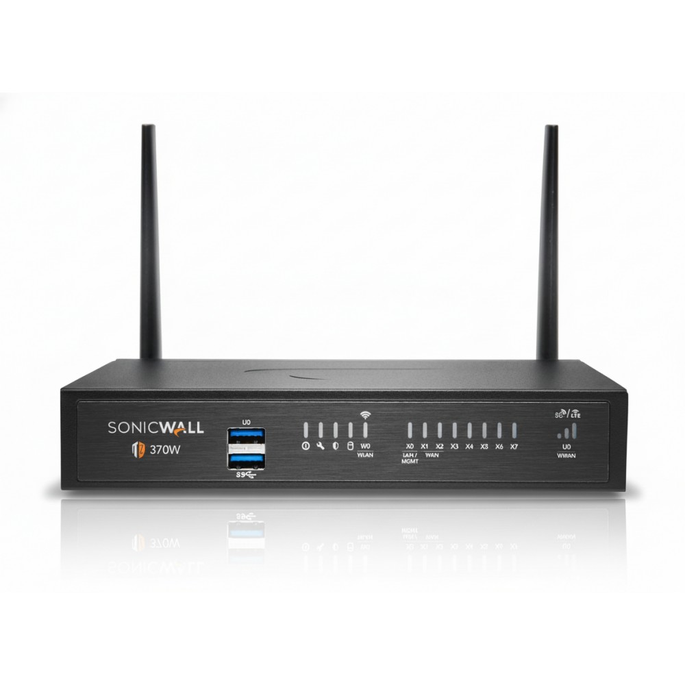 The SonicWall TZ370W is a robust next-generation firewall (NGFW) designed to provide comprehensive network security for small to mid-sized organizations and distributed SD-Branch locations. This appliance addresses the evolving threat landscape, including advanced malware, ransomware, and encrypted attacks, by delivering automated, real-time breach detection and prevention. Its compact desktop form factor integrates advanced security, networking, and wireless capabilities, making it an ideal solution for environments requiring enterprise-grade protection without the complexity. Powered by SonicOS 7.0, the TZ370W features integrated SD-WAN for optimized network performance and cost savings, along with robust VPN capabilities supporting high-speed secure connectivity. It leverages SonicWall's Capture Advanced Threat Protection (ATP) with patented Real-Time Deep Memory Inspection (RTDMI) technology to identify and block unknown threats and zero-day attacks by inspecting directly in memory. TLS 1.3 support and real-time visualization further enhance its security posture against modern cyber threats. Deployment of the TZ370W is streamlined through Zero-Touch Deployment, enabling rapid and consistent rollout across multiple sites with minimal IT intervention. It offers integrated Wi-Fi 5 (802.11ac) for secure wireless access and provides single-pane-of-glass management for SonicWall Switches and SonicWave Access Points, simplifying overall infrastructure oversight. Furthermore, it integrates tightly with Capture Client for seamless endpoint security, offering a cohesive and easily managed security ecosystem.