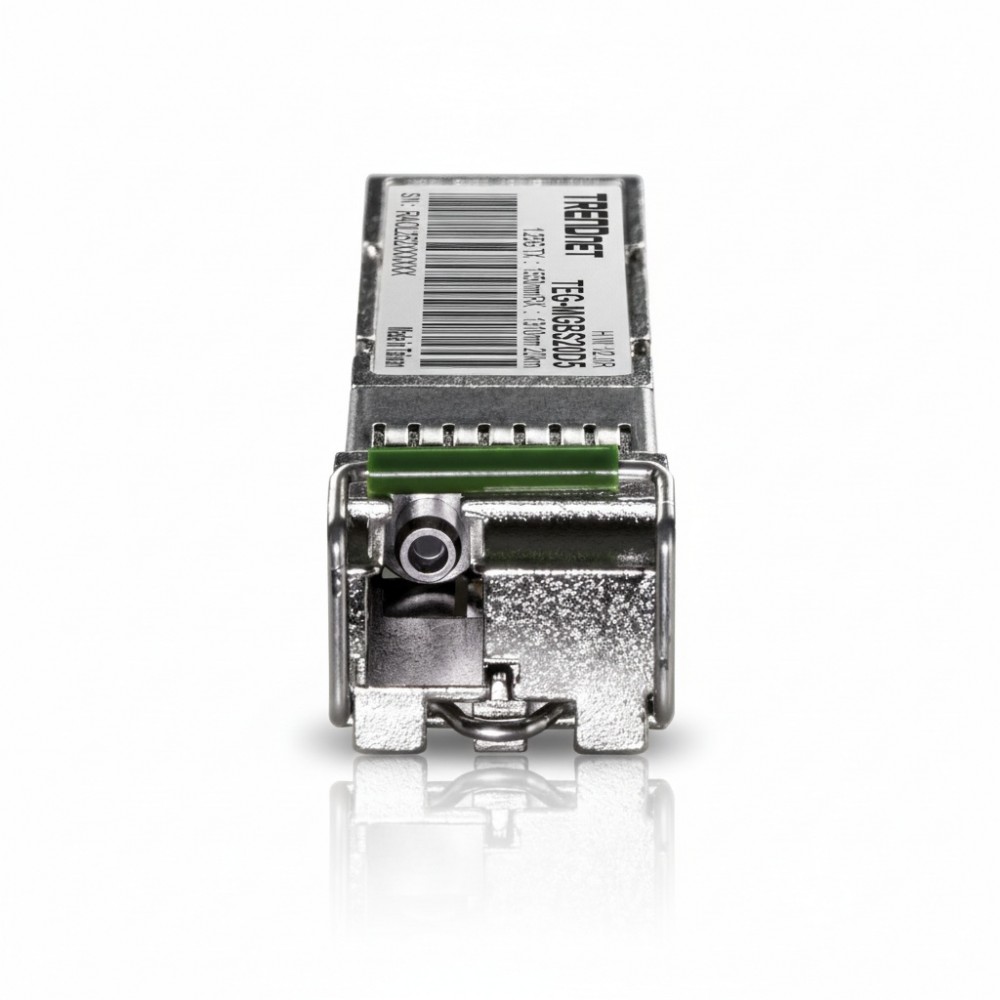 The TRENDnet TEG-MGBS20D5 is a Small Form-Factor Pluggable (SFP) optical transceiver designed for reliable, long-distance fiber optic networking. This module is engineered for single-mode fiber applications, enabling Gigabit Ethernet connectivity over substantial distances. It is an ideal solution for network expansions in campus environments, industrial settings, and geographically dispersed corporate facilities where leveraging existing fiber infrastructure is critical. This transceiver addresses the need to transmit data over a single fiber strand, effectively doubling the capacity of existing fiber cable pairs. At its core, the TEG-MGBS20D5 utilizes Bi-Directional (BiDi) Wavelength Division Multiplexing (WDM) technology. It transmits data on one wavelength (1550nm) and receives data on a different wavelength (1310nm), allowing for two-way communication over a single simplex fiber cable. This approach provides a cost-effective upgrade path for networks by reducing the need for additional fiber optic cabling. For proper operation, it must be paired with a compatible BiDi module, such as TRENDnet's TEG-MGBS20D3, which operates on the corresponding reverse wavelengths. This hot-pluggable module is designed for deployment in any networking device with a standard, MSA-compliant SFP slot, such as industrial switches, media converters, and routers. Its compact metal housing ensures durability and helps to minimize electromagnetic interference (EMI). The single LC simplex connector simplifies installation, providing a secure and high-performance link for data transmission up to 20 kilometers (12.4 miles), making it a versatile component for extending network backbones.