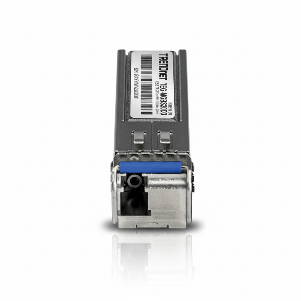 The TRENDnet TEG-MGBS20D3 is a Small Form-Factor Pluggable (SFP) optical transceiver designed for high-speed, long-distance network extensions over single-mode fiber (SMF). This module is specifically engineered for environments such as enterprise campuses, manufacturing facilities, and geographically dispersed buildings that require reliable Gigabit Ethernet connectivity over significant distances. It solves the common challenge of extending network reach beyond the limitations of standard copper cabling by utilizing fiber optic technology. This transceiver leverages Bi-Directional (BiDi) Wavelength Division Multiplexing (WDM) technology, which allows for the transmission and reception of data over a single fiber strand. This innovative approach effectively doubles the capacity of existing fiber infrastructure, offering a cost-effective upgrade path without the need to install new cabling. The TEG-MGBS20D3 transmits at a 1310nm wavelength and receives at 1550nm, requiring it to be paired with a corresponding module, such as the TEG-MGBS20D5, which operates on the reverse wavelengths. Designed for seamless integration, this hot-pluggable module is compliant with the SFP Multi-Source Agreement (MSA), ensuring compatibility with any MSA-compliant SFP slot found on network switches and fiber media converters. Its durable metal enclosure provides low electromagnetic interference (EMI), ensuring signal integrity in demanding environments. The module features a simplex LC connector and is built to support network links up to 20 kilometers (12.4 miles), delivering consistent 1.25Gbps throughput.