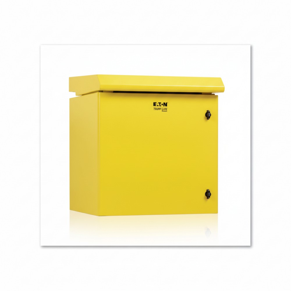 The Eaton SRN3RY12U is a robust 12U industrial wallmount rack enclosure, specifically engineered to safeguard sensitive 19-inch rack-mount equipment in challenging environments. This enclosure is ideally suited for deployment in demanding indoor or covered outdoor locations, such as factories, construction sites, utility plants, and transportation hubs, where protection from environmental elements is critical. Its NEMA 3R rating ensures comprehensive protection against ingress from rain, sleet, snow, falling dirt, and external ice formation, making it a reliable solution for mission-critical hardware in harsh conditions. Constructed from durable steel with a high-visibility yellow powder-coated finish, the enclosure provides both physical security and corrosion resistance. The fully welded steel housing features a lockable door, protecting installed equipment from theft, tampering, and unauthorized access. With a maximum load capacity of 200 pounds (90.7 kilograms), it can securely house a variety of network switches, patch panels, and other essential IT components. Designed for efficient thermal management, the SRN3RY12U includes built-in internal fans that help maintain optimal operating temperatures for enclosed equipment, enhancing longevity and performance. This enclosure ships fully assembled, simplifying installation with user-supplied hardware, and its independently adjustable front and rear mounting rails accommodate equipment up to 23 inches deep. Integrated cable management with a bottom conduit cutout further streamlines deployment and maintenance.