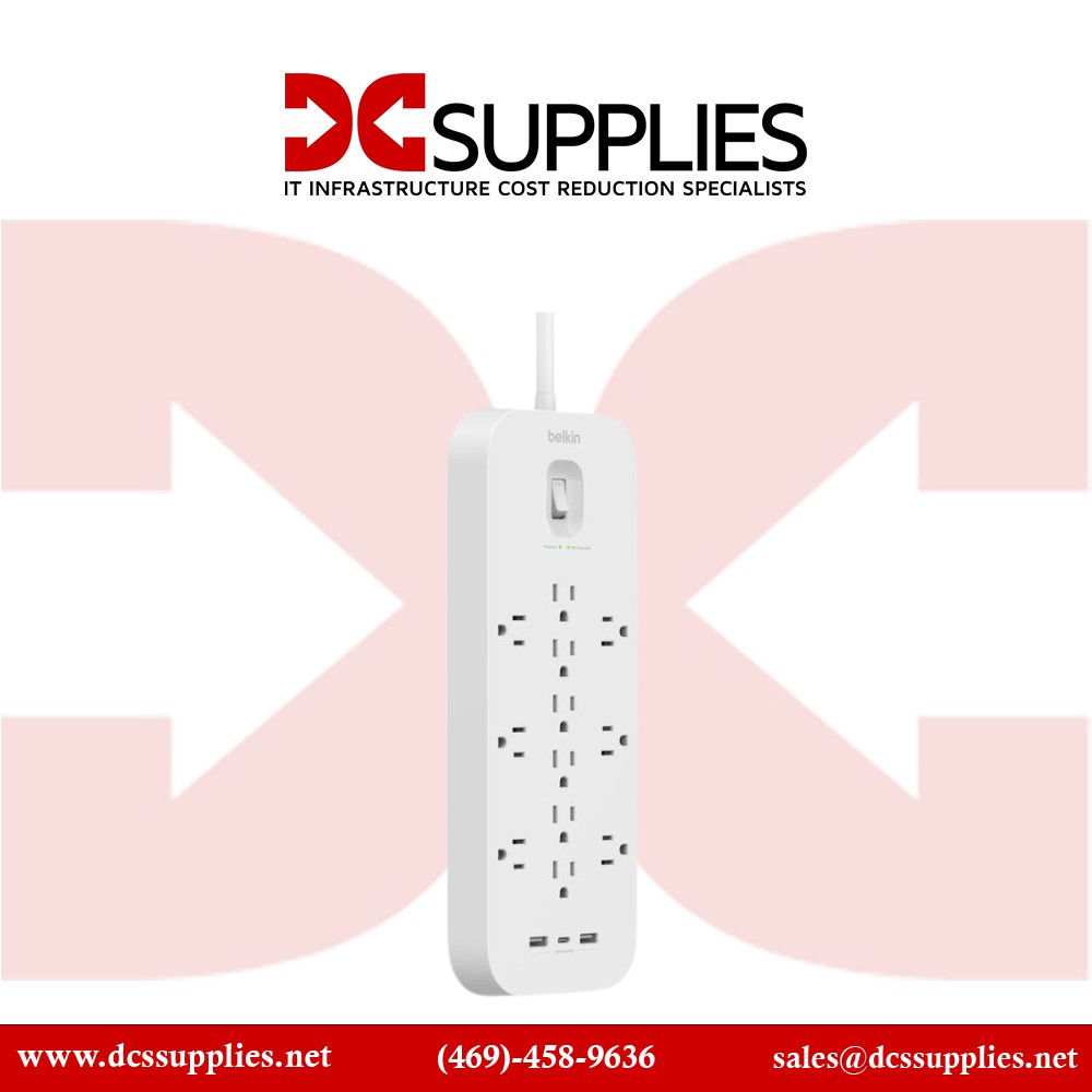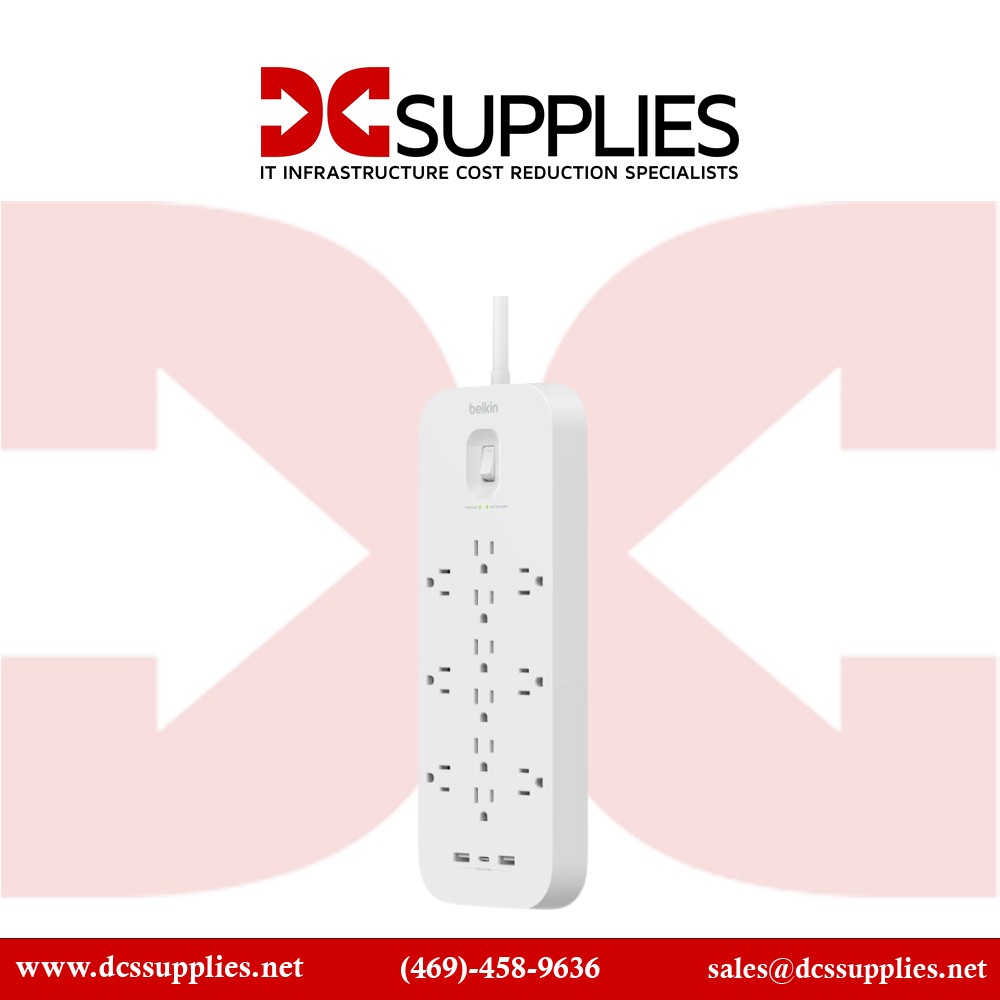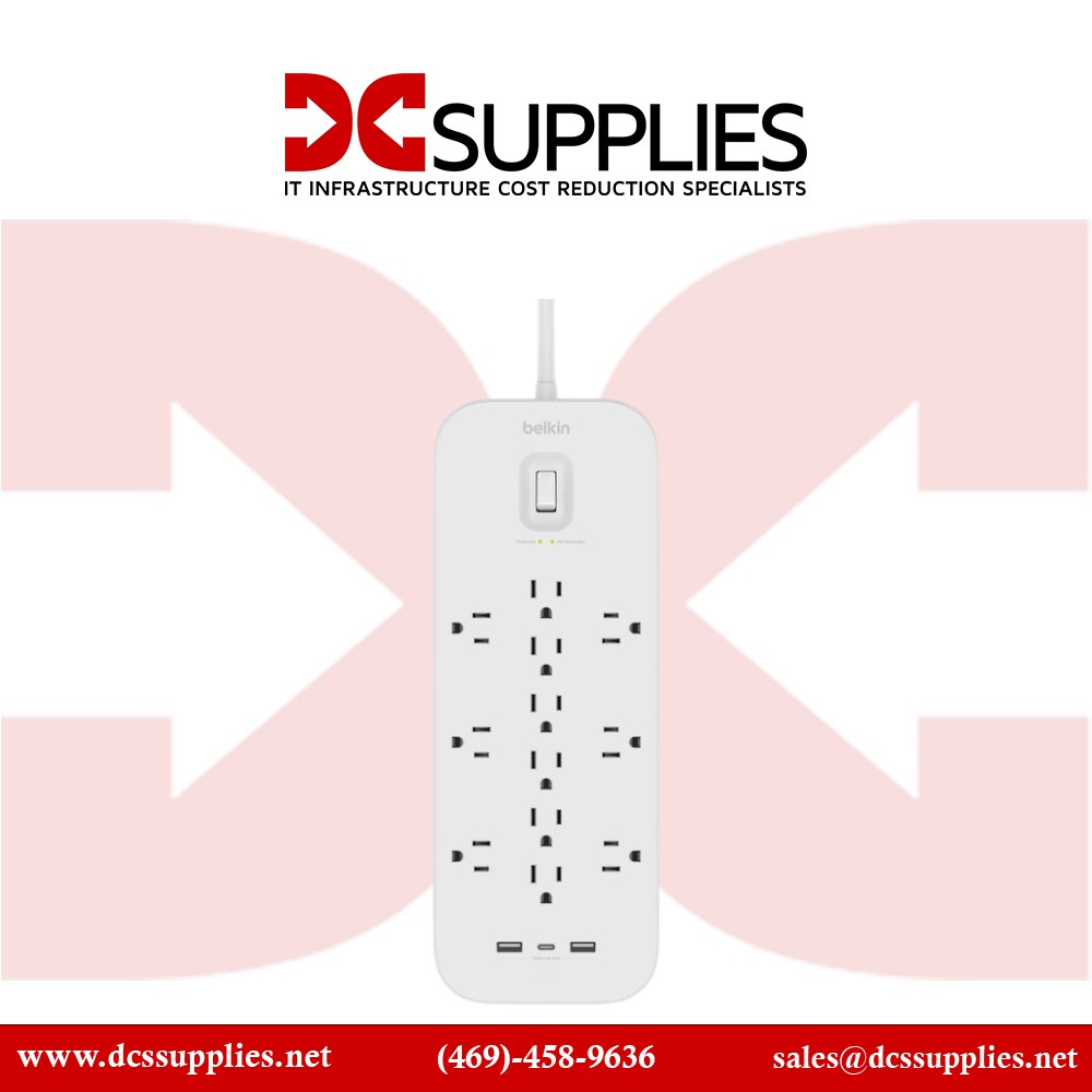 Belkin SRA007P12TT6 12-outlet surge protector with USB-C and USB-A ports ensures safe, versatile power distribution.
