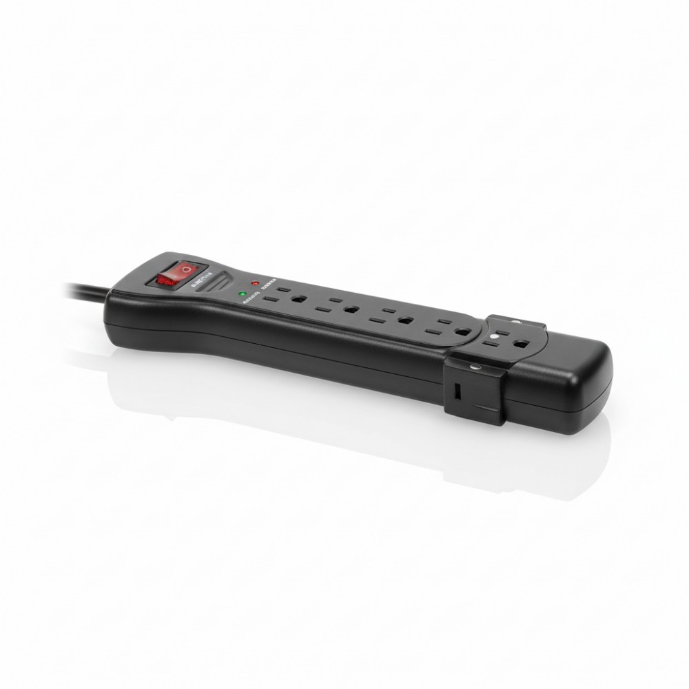 The Eaton Tripp Lite SUPER7B is a 7-outlet surge protector designed for home and office environments. It offers 2160 joules of surge protection to safeguard sensitive electronics from power spikes. The unit features a 7-foot AC power cord with a right-angle NEMA 5-15P plug, facilitating flexible placement. Its compact black plastic housing includes keyhole slots for wall or desk mounting.