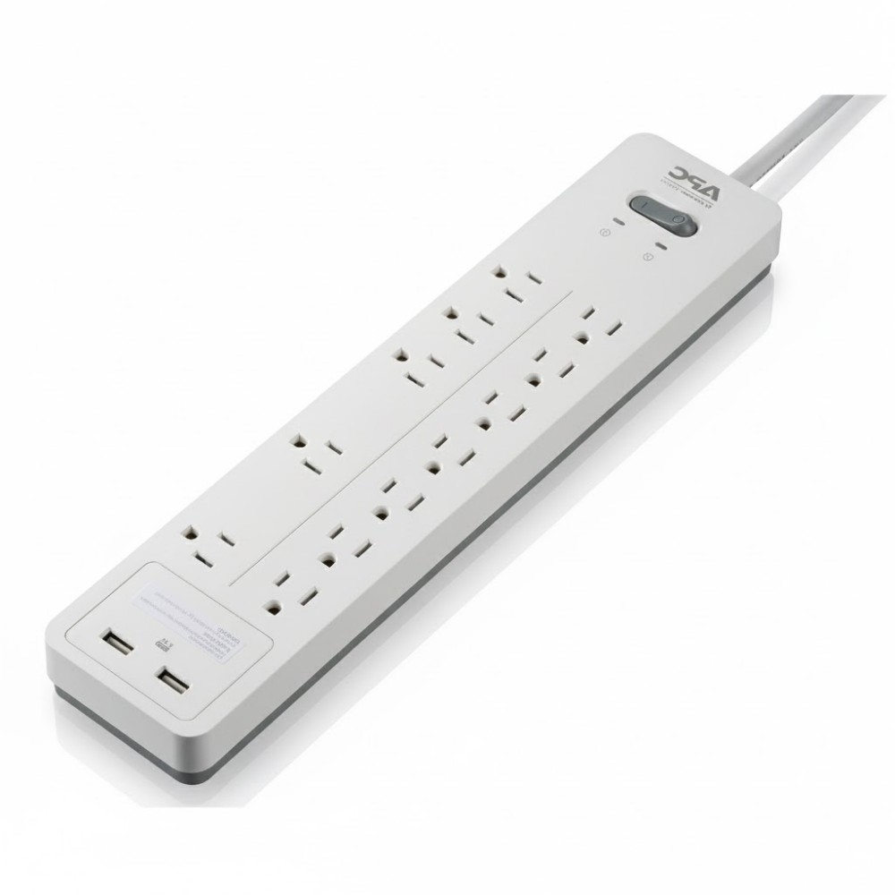 12-outlet surge protector with 2 USB ports and 4320 Joules protection.