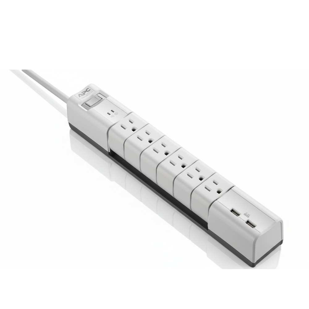 The APC PE6RU3W is a versatile 6-outlet surge protector designed to meet the power needs of modern workspaces. It features six rotating NEMA 5-15R outlets, allowing for flexible plug orientations to accommodate various device plugs. Additionally, it includes two USB Type-A charging ports that deliver a total of 3.4A, enabling efficient charging of smartphones, tablets, and other USB-powered devices. With a surge energy rating of 1080 joules, this surge protector provides robust protection against power surges and spikes, safeguarding connected equipment from potential damage. Its compact design and 6-foot power cord offer convenient placement options, making it suitable for home offices, workstations, and entertainment centers.