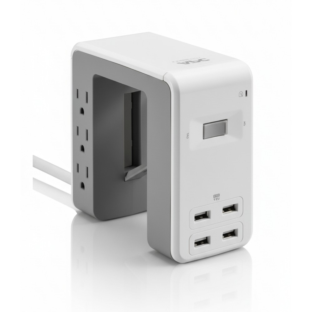 The APC PE6U21W is a compact, desk-mountable surge protector designed to safeguard electronics in home offices, workstations, and entertainment setups. It offers six surge-protected AC outlets and three USB ports (two Type-A and one Type-C) with a combined 4.8A charging capacity, making it ideal for powering and charging multiple devices simultaneously. With a surge energy rating of 1,080 joules, it provides robust protection against power surges and spikes. The unit features a fail-safe mode that disconnects power at the end of its life, ensuring connected devices are not exposed to unprotected power. Its versatile design allows it to be mounted on desks or cubicle walls up to 2.4 inches thick, keeping your workspace organized and clutter-free. The 6-foot power cord with a flat right-angle plug facilitates flexible placement, even in tight spaces. Certified with RoHS and REACH, it meets environmental standards, and APC backs it with a lifetime warranty and a $50,000 connected equipment guarantee.