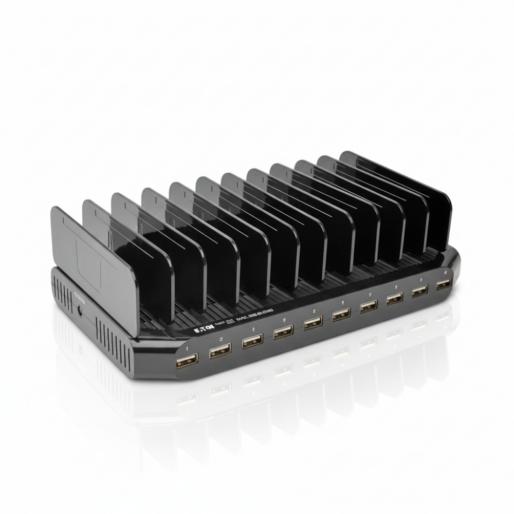The Eaton U280-010-ST-CEE is a robust 10-Port USB Charging Station engineered to efficiently power and organize multiple mobile devices within diverse professional environments. This unit serves as an essential component for offices, classrooms, conference rooms, or any setting where numerous smartphones, tablets, and other USB-powered devices require simultaneous charging without the clutter of individual power adapters. It addresses the common challenge of power outlet scarcity and cable management, ensuring devices remain charged and accessible. Equipped with advanced charging technology, this station delivers up to 5V 2.4A to each of its ten USB ports, providing ample power for even battery-intensive devices. It complies with the USB Battery Charging (BC) specification v1.2, ensuring optimized and safe power delivery. Furthermore, the unit integrates critical safety features, including protection against overheating, overcurrent, and overcharging, safeguarding connected devices and the charging station itself from potential electrical hazards. Designed for operational simplicity and flexibility, the charging station features an external dual-voltage power supply (100V–240V, 50/60 Hz) and includes a C5 to CEE 7/7 Schuko power cord, making it suitable for use in regions utilizing this standard. Its compact form factor and adjustable storage brackets allow for neat organization of devices during charging, improving workspace aesthetics and efficiency. A front-panel LED clearly indicates when the unit is receiving AC power, providing immediate status feedback.