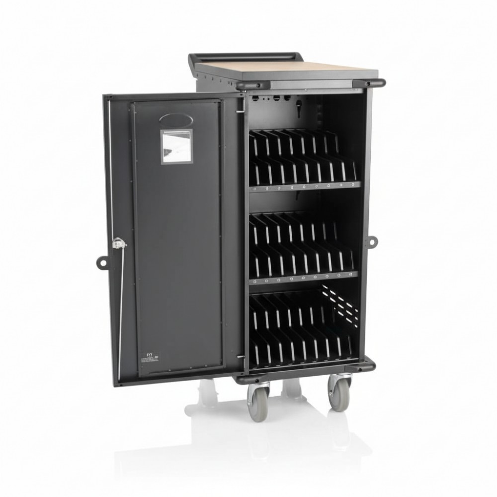 The Eaton CSC27AC is a robust mobile charging and storage solution engineered to streamline the management of up to 27 laptops or Chromebooks. Designed for demanding environments such as educational institutions, healthcare facilities, and enterprise offices, this charging cart provides secure storage and reliable AC power for multiple devices, addressing the critical need for organized, charged, and readily available mobile computing assets. Beyond its charging capabilities, the CSC27AC incorporates essential technical features to ensure operational efficiency and device protection. Each of the 27 internal NEMA 5-15R outlets delivers 120V AC power, protected by a built-in circuit breaker that safeguards connected devices against electrical overloads. Constructed from heavy-duty steel with a durable black powder-coated finish, the cart offers a secure enclosure, preventing theft and tampering while accommodating devices with screens up to 15 inches. Deployment and daily management are simplified by the cart’s intelligent design. Large, non-marking swivel casters and a wide-grip handle enable smooth, easy transport between rooms, protecting walls and doorways with integrated corner safety bumpers. Internal cable management, including removable baskets and overhead cable organizers, keeps power adapters and cords neat and tangle-free. Additionally, a laminated wood-grain top provides a convenient workstation surface, and an in-cabinet RJ45 pass-through jack supports network connectivity for device updates.