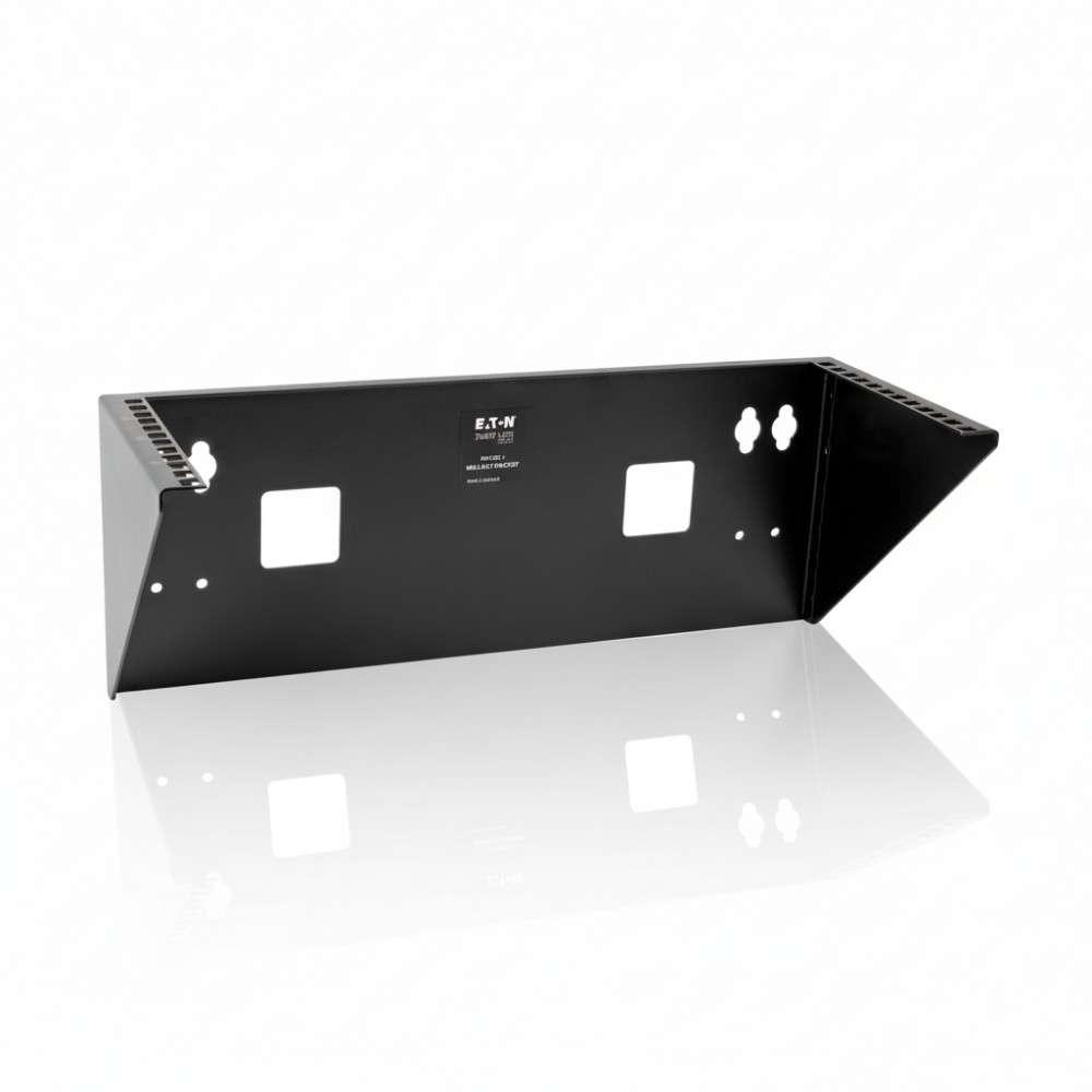 The Eaton SRWALLBRKT4U is a robust 4U vertical wall-mount rack bracket from the Tripp Lite SmartRack series, meticulously engineered for optimizing space in environments where traditional floor-standing racks are impractical. Designed to cater to home offices, small businesses, and network closets, this bracket provides a reliable solution for mounting essential IT infrastructure components like network switches, patch panels, or UPS systems without consuming valuable floor space. It directly addresses the challenge of deploying equipment in compact areas, ensuring operational efficiency and organized cabling. Constructed from heavy-duty cold-rolled steel with a durable black powder-coated finish, the SRWALLBRKT4U bracket is built for long-term stability and security. It is compatible with EIA-standard 19-inch 2-post rack equipment and boasts a substantial maximum load capacity of 175 pounds, accommodating a wide range of devices with confidence. The open-frame design not only minimizes the bracket's footprint but also provides unrestricted access to mounted equipment and cabling, simplifying installation, maintenance, and future upgrades. Deployment of the SRWALLBRKT4U is highly flexible, allowing for either vertical installation on a wall or horizontal mounting beneath a desk or workbench for convenient access. The wall-mounting holes are strategically spaced 16 inches apart to align with standard wall studs, facilitating straightforward and secure attachment using user-supplied hardware. This versatile mounting approach, combined with its pre-assembled shipping, ensures rapid deployment and contributes to a clean, efficient IT setup.